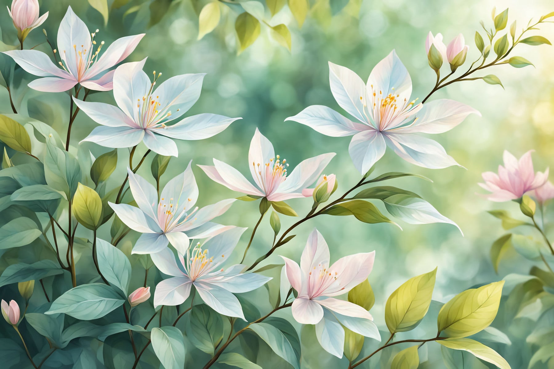 Immerse yourself in a world of delicate beauty with this wallpaper, featuring a whimsical array of white and blush pink blossoms. The hand-painted style lends an air of charming artistry, while the soft color palette creates a sense of gentle peace. The intricate details of each flower and leaf, combined with the blurry green background, lend a dreamy quality to the image. This wallpaper is a perfect choice for adding a touch of romantic elegance to bedrooms, living rooms, or any space that needs a dose of soothing charm. Its delicate artistry and soothing palette make it an ideal addition to spaces seeking tranquility.