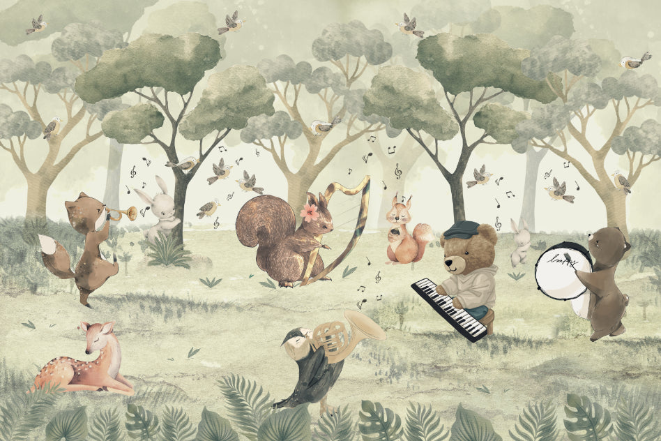 Whimsical Wildlife Concert Wallpaper captivates the imagination with a lively ensemble of forest animals engaged in a musical jubilee. This enchanting kids room wallpaper invites young minds to a world where notes float through the air and every creature adds its unique melody to the symphony of nature. Perfect for little ones who dream in tune with adventure and charm, it offers a playful retreat into a storybook setting. Each illustrated critter, from the diligent piano-playing badger to the cheerful fluting bear, brings joy and a touch of whimsy to your child's personal haven. Enrich their room with this magical scene, fostering creativity and dreams of harmonious woodland escapades.