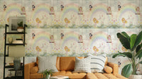 This enchanting wallpaper transports you to a dreamy world of pastel hues and playful characters. Delicate watercolor flowers bloom beneath a vibrant rainbow, while adorable girls embark on whimsical adventures – one soaring in a hot air balloon, another swinging gently amidst blossoming branches. Butterflies flutter freely, adding to the ethereal ambiance. The soft color palette and hand-drawn style create a serene and captivating scene, perfect for a child's room or any space needing a touch of magic and wonder.