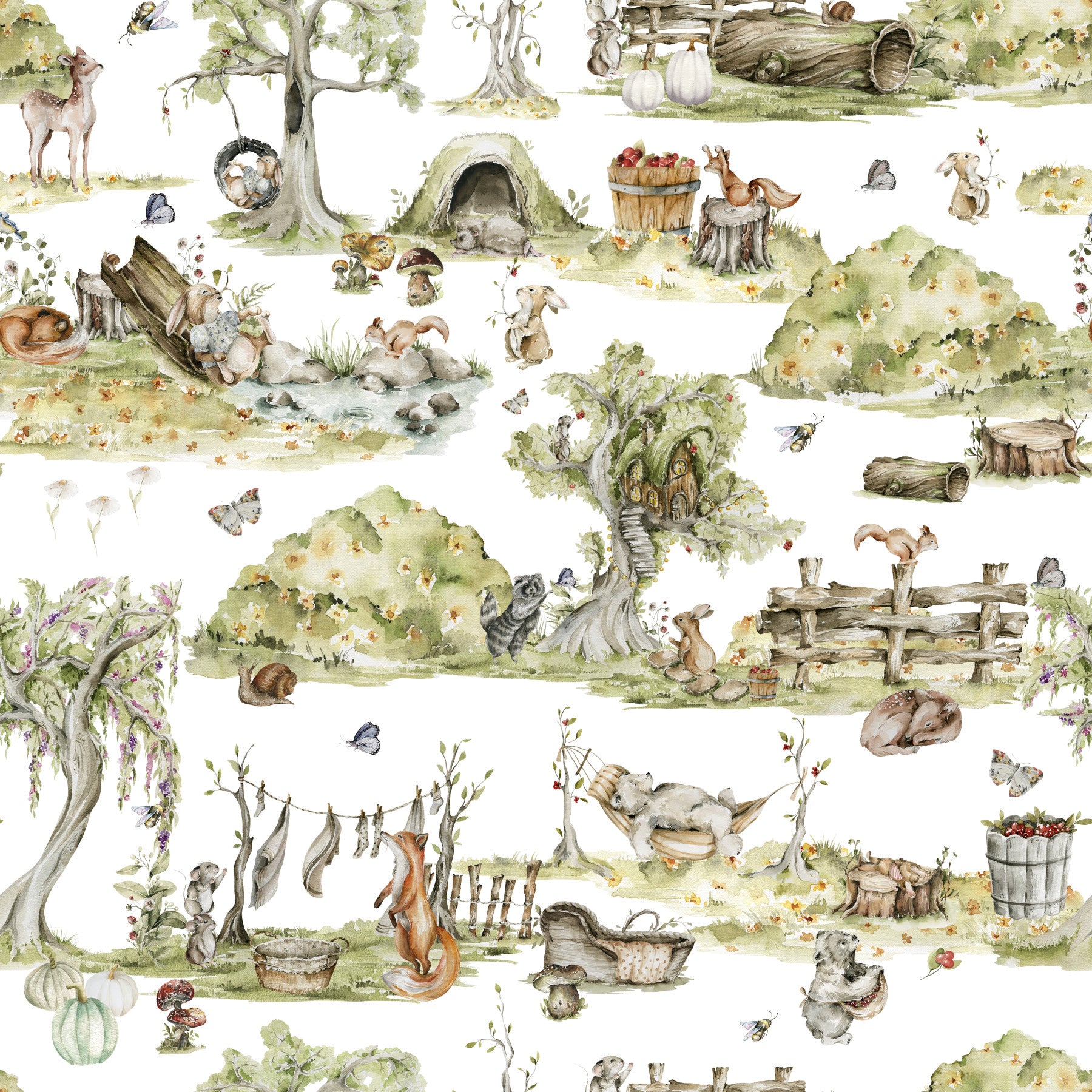 Bring the charm of a storybook forest to your home with this delightful wallpaper by Uta Naumann. This design shows cute watercolour animals having fun in a green and beige woodland setting. It features a deer, bunny, fox, and bear along with trees, flowers, and other natural elements, all in a soft palette. This wallpaper for walls is perfect for a nursery, kids' room, or playroom. The watercolour style and cute animal characters create a peaceful and joyful atmosphere. This design makes interiors feel cosy, calm and imaginative. It creates a space where children can feel like they are visiting a fairy tale.