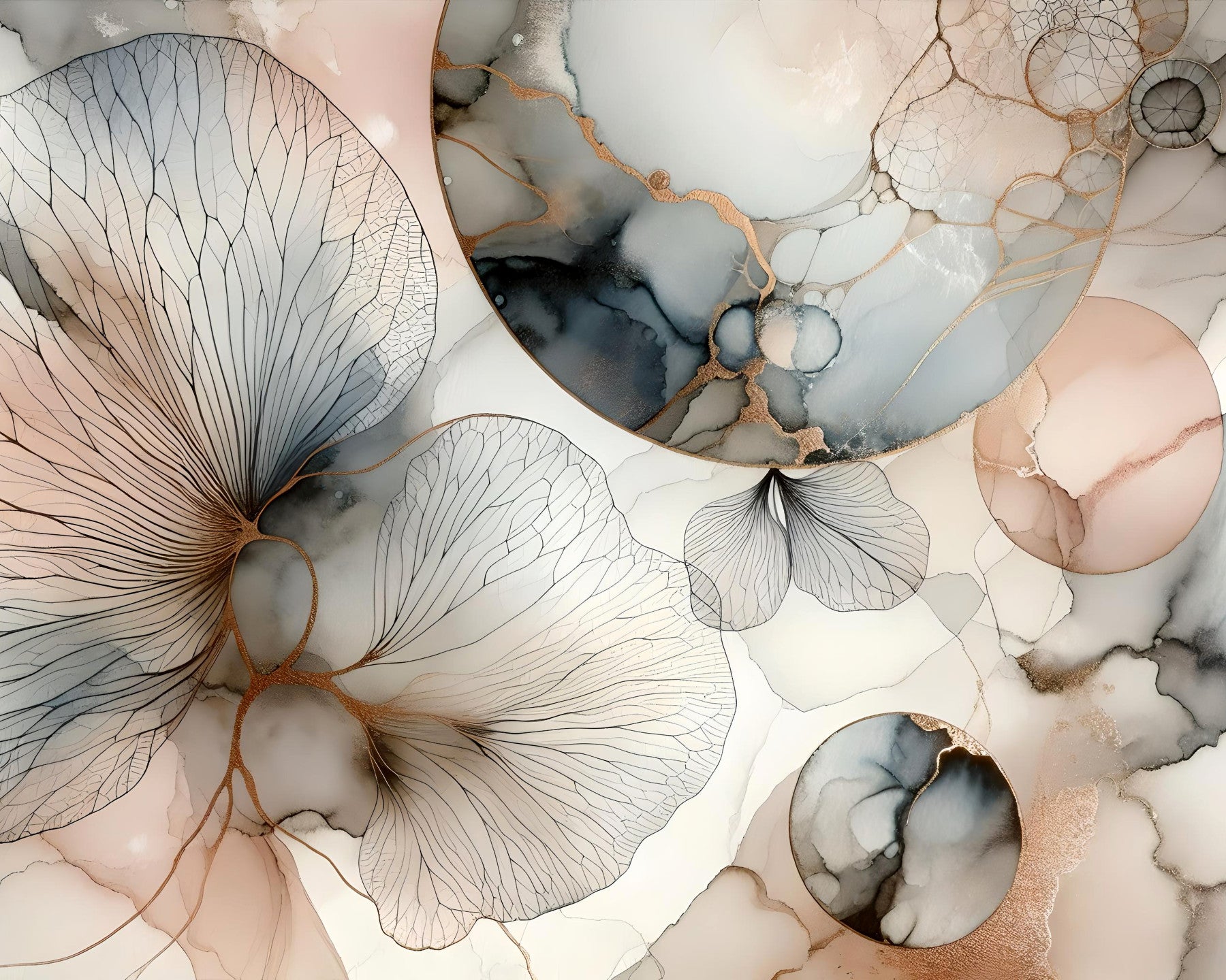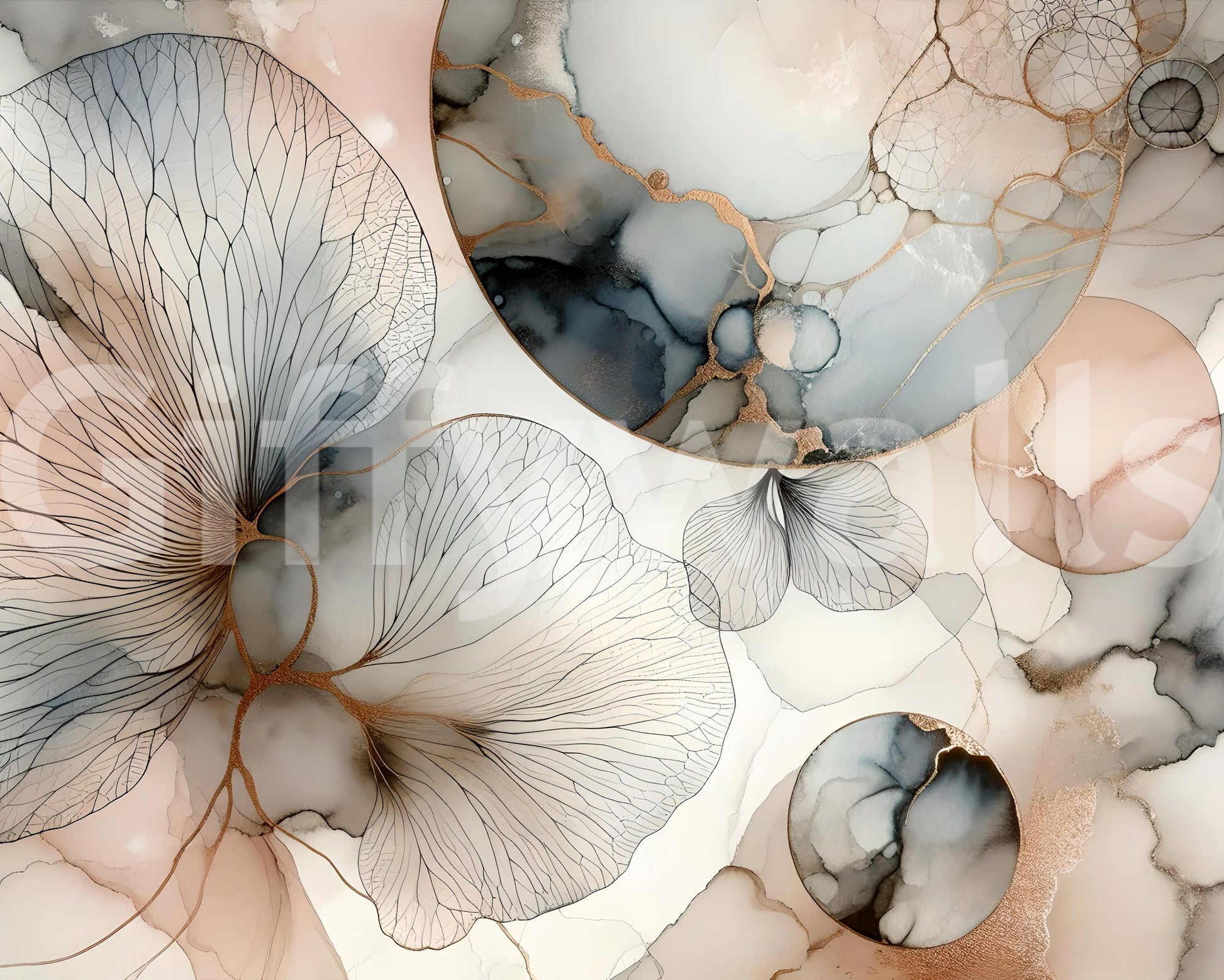 This wallpaper evokes a sense of tranquil beauty with its delicate interplay of abstract floral forms and fluid, marble-like textures. Soft blush pinks, cool grays, and accents of rose gold create a harmonious palette that's both sophisticated and calming. The intricate vein-like details of the floral elements add a touch of elegance, while the flowing alcohol ink background provides a sense of gentle movement. This design is perfect for creating a serene and sophisticated atmosphere in any room, bringing a touch of understated luxury to your home décor.