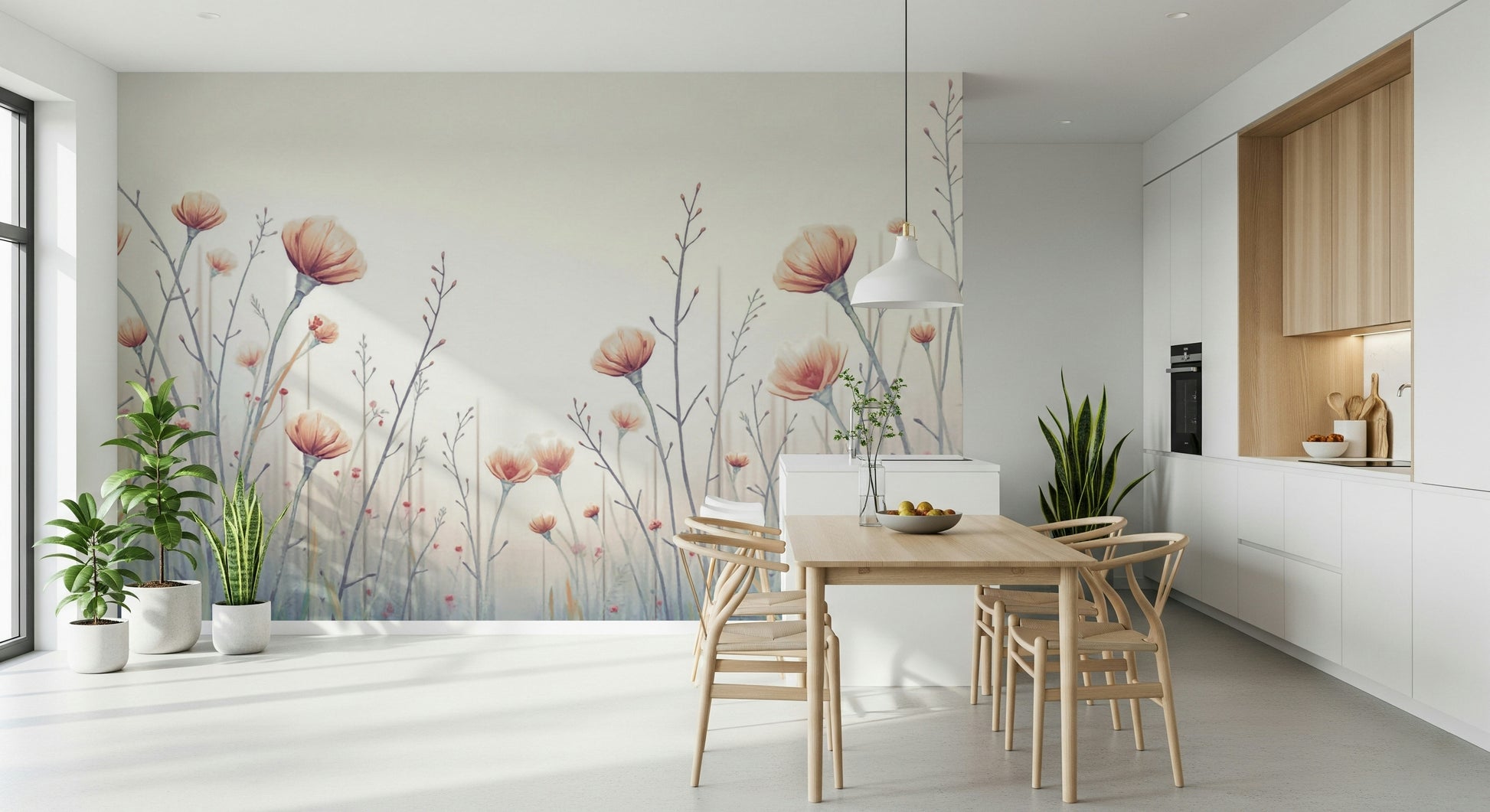Infuse your home with the understated charm of this floral wallpaper! Featuring graceful blossoms in subtle peach tones, set against a backdrop of muted greens and blues, it exudes a soothing and elegant vibe. This wallpaper for walls brings the beauty of a wildflower meadow indoors, creating a tranquil ambiance. The watercolour-like effect offers a soft, diffused aesthetic, ideal for bedrooms or any space where you desire a calm, relaxing atmosphere. Let this design effortlessly complement your interior, adding a touch of nature's beauty with a contemporary touch.