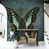 Colourful tropical Butterfly with vintage effects. Invite a touch of enigmatic beauty into your space with "Whispering Butterfly Aura." This wall décor piece presents a mesmerising butterfly, its wings a delicate dance of midnight black and serene aqua, poised against a textured backdrop that evokes the feel of aged parchment. Faint whispers of script fade into the teal canvas, hinting at hidden stories and bygone eras. The butterfly, a symbol of transformation and ethereal grace, casts a subtle aura, bringing a sense of tranquil mystery to any room. Its presence isn’t bold or loud, but rather a soft, calming influence, encouraging reflection and peaceful contemplation. This unique piece transforms any wall into a statement of subtle sophistication.