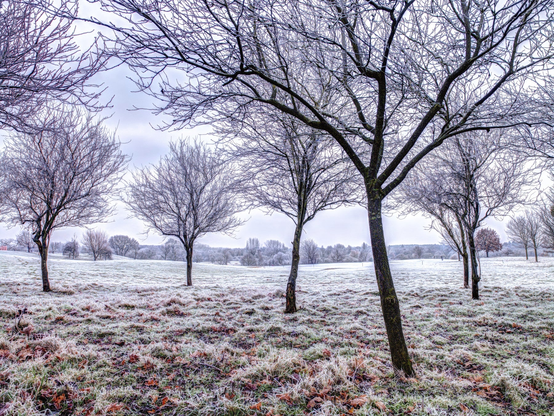 Trees in frosty field. Immerse yourself in the tranquil beauty of "Frosted Meadow Dream," a wallpaper that captures the ethereal essence of a winter's embrace. This stunning image showcases a serene meadow, lightly dusted with frost, where skeletal trees stand as silent sentinels against a pale sky. Each branch is delicately outlined with ice crystals, creating a mesmerising display of natural artistry. The ground, a tapestry of frosted grass and fallen leaves, shimmers with a subtle iridescence, reflecting the soft, diffused light of the overcast day.
