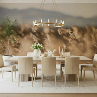 Immerse yourself in the serenity of a sunlit field with this wallpaper for walls. Observe how the wheat sways gently in the breeze, casting a soft, beige hue across any room. The muted tones and blurred mountain backdrop create a calming effect, perfect for bedrooms or living areas. Let this nature-inspired design bring a touch of rustic charm to your home, complementing minimalist or boho interiors with its understated beauty.