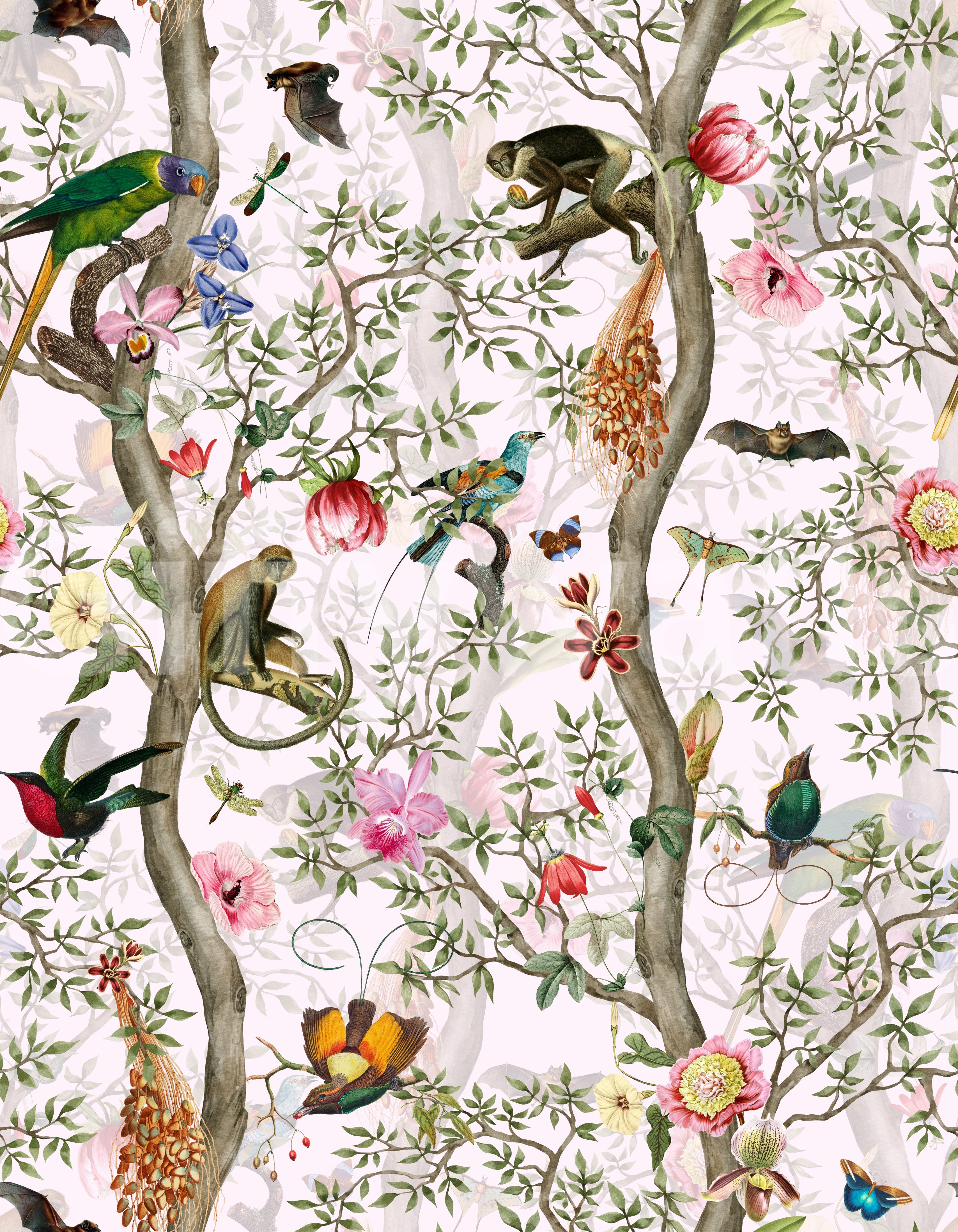Immerse yourself in the mysteries of the jungle with this captivating wallpaper. Detailed illustrations of exotic birds, playful monkeys, and nocturnal bats weave through a dense tapestry of vibrant flowers and lush foliage. The soft watercolor style creates a dreamlike atmosphere, while the rich colors and intricate details capture the beauty and wonder of the natural world. This wallpaper is a perfect addition to any space seeking a touch of mystery and elegance, inviting a sense of tranquil escape.