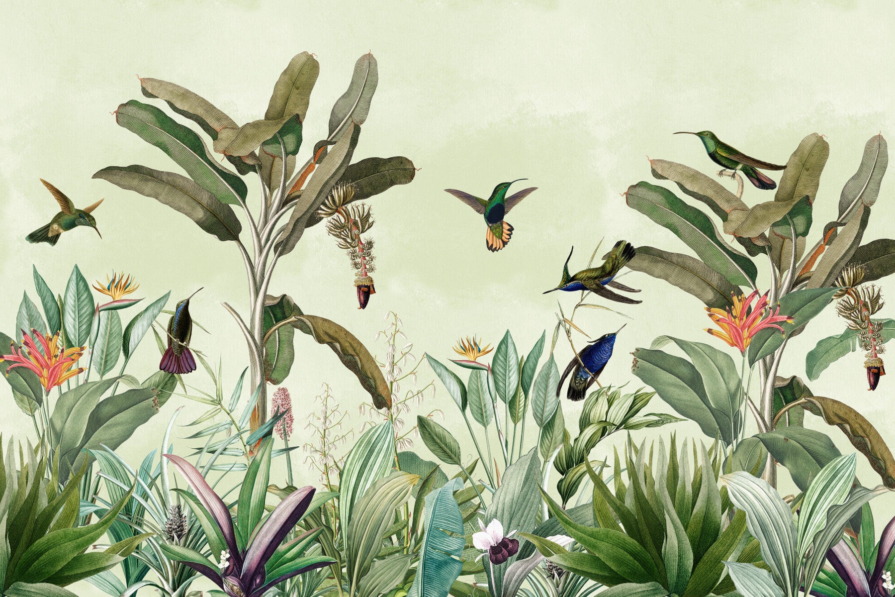 Immerse yourself in the vibrant beauty of a hidden jungle with this enchanting wallpaper. Delicate hummingbirds dance amongst a profusion of exotic plants, their iridescent feathers shimmering against the soft, pastel green backdrop. The intricate detailing and vintage-inspired aesthetic create a sophisticated and calming atmosphere, perfect for a tranquil bedroom or a relaxing living space. This wallpaper is more than just decoration; it's an invitation to escape and reconnect with the natural world.