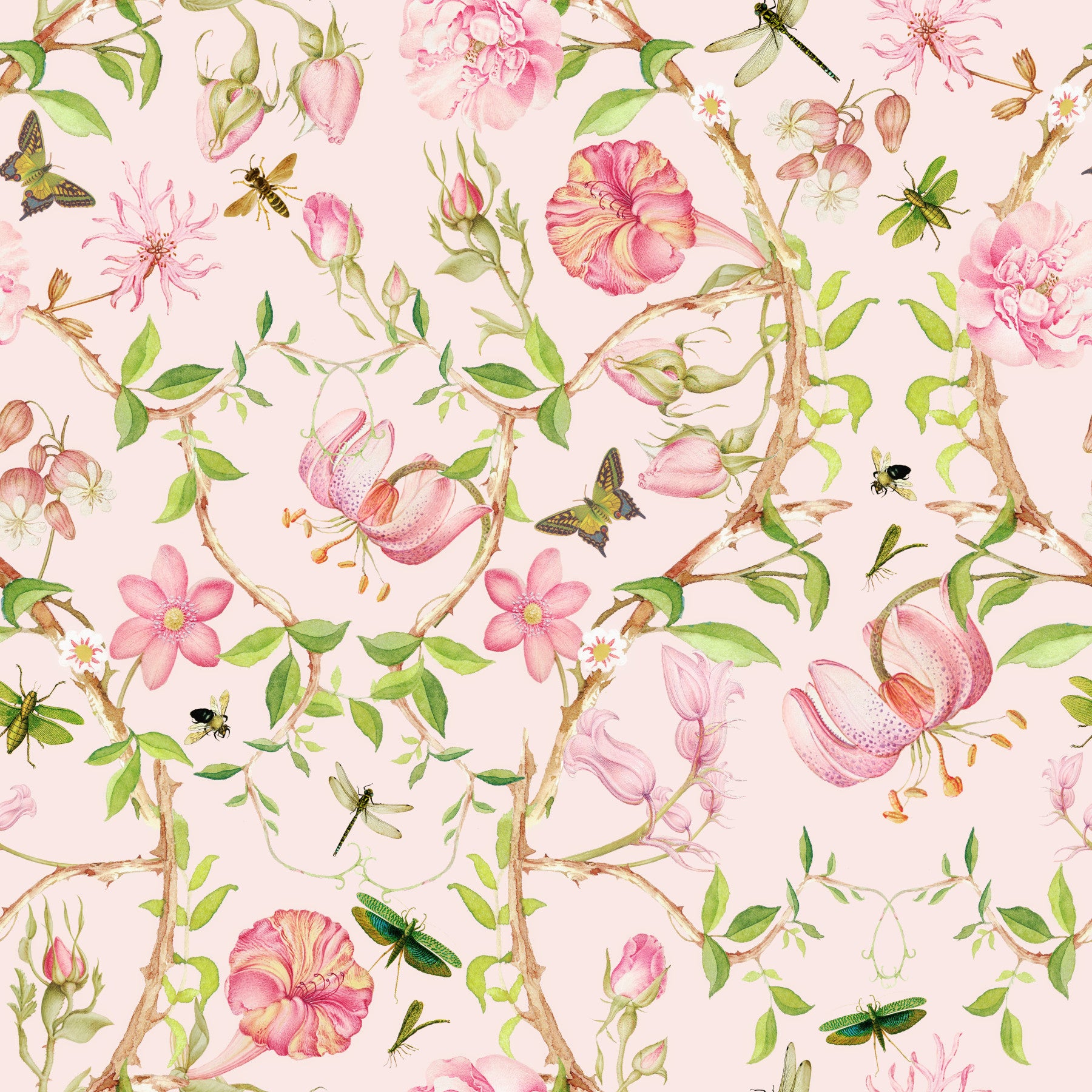 This enchanting wallpaper transports you to a secret garden brimming with delicate watercolor blooms. Lilies, roses, and other exquisite flowers intertwine with graceful branches, creating a romantic and serene atmosphere. Butterflies and dragonflies flutter amongst the blossoms, adding a touch of whimsical charm. The soft blush pink background enhances the pastel hues of the floral designs, creating a tranquil and elegant ambiance perfect for bedrooms, living rooms, or any space needing a touch of sophisticated beauty. The intricate detailing evokes a sense of timeless elegance and quiet sophistication, making it a captivating addition to any home decor.