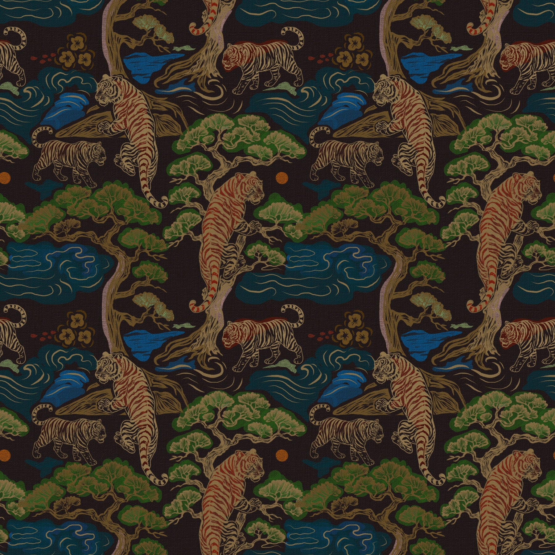 Immerse yourself in a world of serene beauty with this tiger and grove-themed design. The rich browns and greens, paired with flowing blues, create a calming yet dynamic atmosphere. This wallpaper for walls will elevate any bedroom, living room, or dining room, enhancing both classic and modern design schemes. Let it transform your space with a touch of nature's elegance, bringing the tranquility of a grove directly into your home.