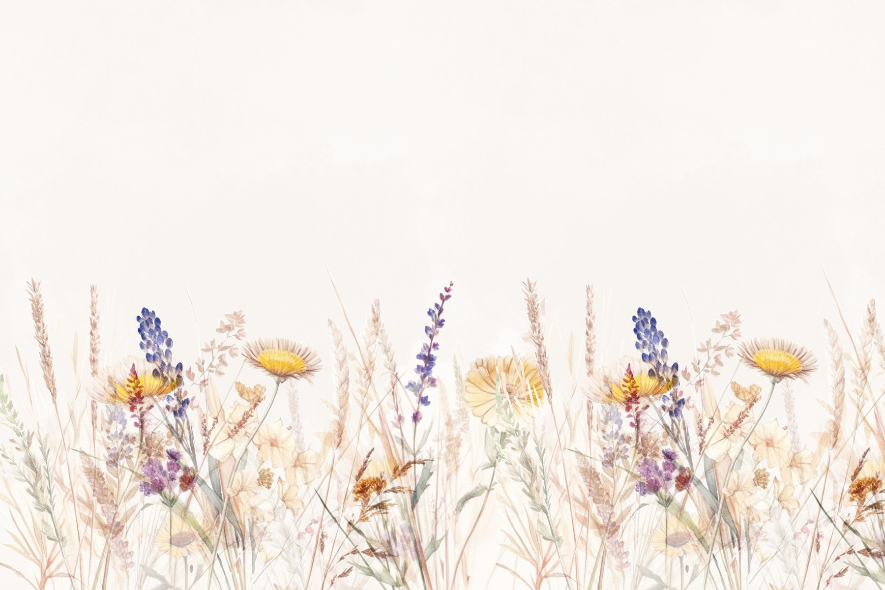 This watercolor wallpaper evokes a serene and dreamy atmosphere. Delicate wildflowers in soft hues of blush pink, pale yellow, and muted purple dance against a tranquil off-white background. The ethereal quality of the watercolor creates a sense of calm and tranquility, making it perfect for bedrooms, living rooms, or any space where a peaceful ambiance is desired. The soft, romantic colors and delicate floral details create a soothing and inviting atmosphere, perfect for relaxation and introspection. The subtle repetition of the floral pattern provides a gentle rhythm and visual interest without being overpowering.