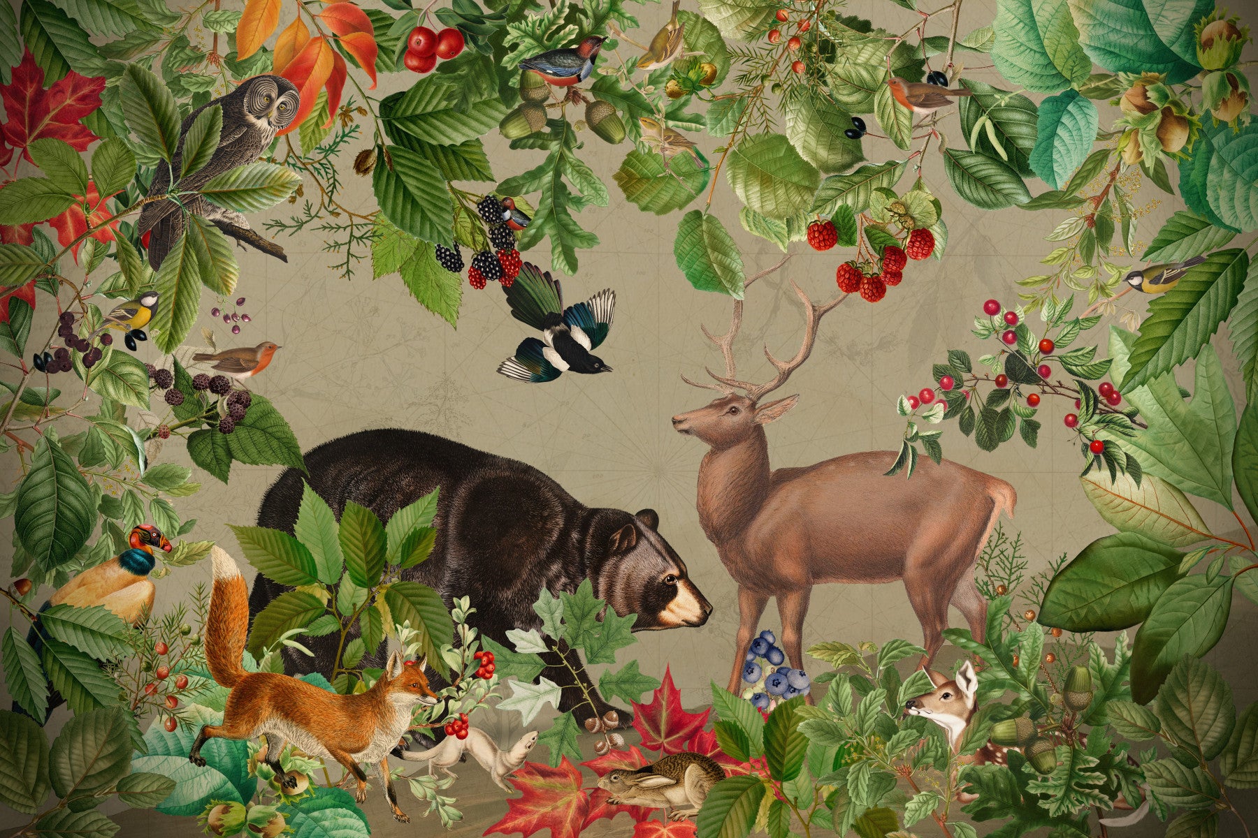 Escape to the tranquility of the forest with 'Whispers of the Wildwood,' a stunning wallpaper design. This captivating piece features a rich tapestry of meticulously detailed botanical illustrations and wildlife, set against a soft, earthy background. From the majestic deer and watchful bear to the playful fox and a multitude of birds, each element is rendered with exquisite detail, creating a truly immersive natural scene. The warm autumnal colors and intricate details make this wallpaper a perfect choice for adding a touch of sophisticated elegance and natural charm to your space. Let the gentle whispers of the forest bring peace and tranquility to your home.