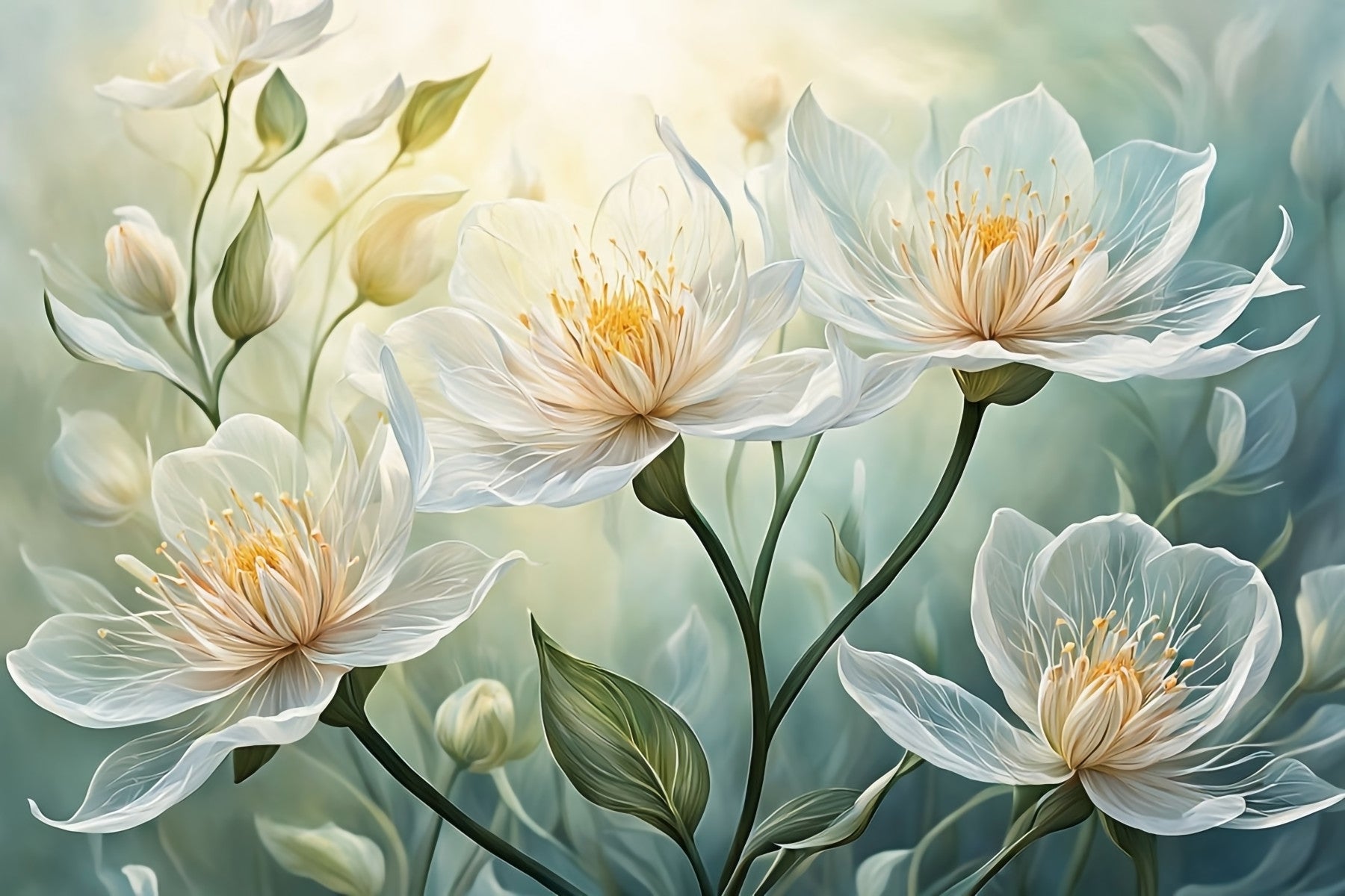 Immerse yourself in the delicate beauty of 'Whispers of White,' a wallpaper design that captures the subtle elegance of blooming flowers. The artist's masterful brushstrokes create a soft, almost translucent effect, allowing the light to gently permeate each petal. The creamy white blossoms contrast beautifully against the muted green foliage, evoking a sense of tranquility and quietude. This design is perfect for creating a soothing and sophisticated atmosphere in any room of your home, offering a touch of understated luxury and peaceful serenity. The calming effect is enhanced by the soft, almost ethereal quality of the flowers.