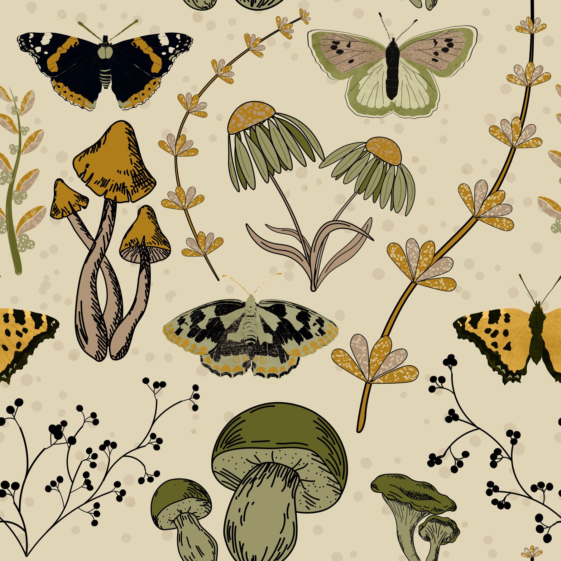 Embrace the beauty of autumn with this charming wallpaper. A medley of hand-drawn mushrooms and wildflowers in muted greens, mustards, and browns are accented by the delicate wings of butterflies in warm, earthy tones. The soft, neutral background creates a comforting and nostalgic ambiance, making it perfect for adding a touch of rustic charm to any room. The seamless pattern allows for a cohesive and versatile design.