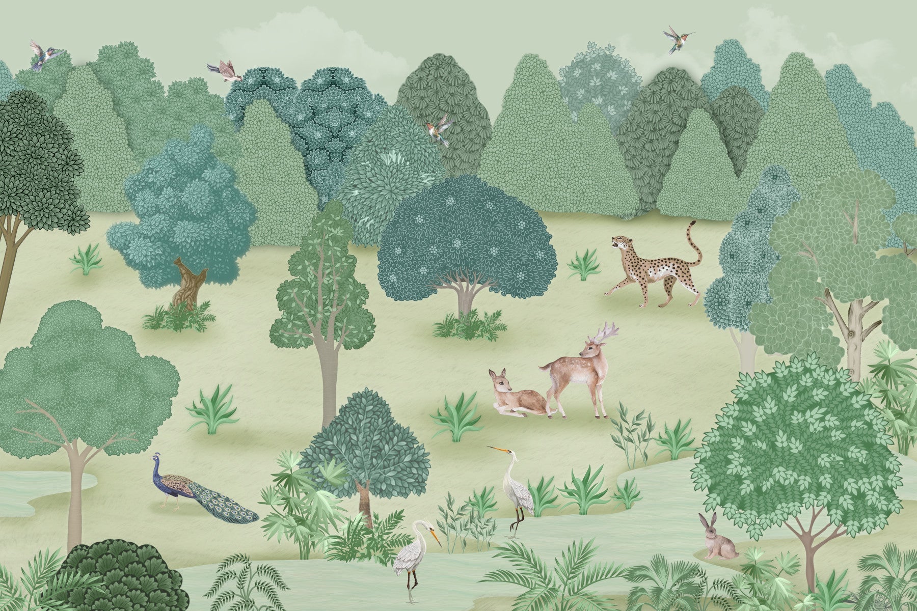 Transform any space with this stylish depiction of wildlife within a serene forest. The design showcases animals like deer, peacocks, and cheetahs amidst stylised trees and a muted green palette. This wallpaper for walls brings a touch of sophisticated charm to spaces such as the living room, dining room, or even a hallway. The tranquil setting easily complements interiors, creating an atmosphere of calm and elegance.