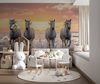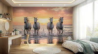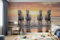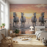 This stunning wallpaper for walls brings the majestic beauty of wild horses to your living space. Four powerful white horses gallop through shallow ocean waters, creating dynamic splashes that capture their raw energy. The breathtaking sunset sky features a harmonious blend of soft oranges, warm yellows, and delicate pinks, casting a golden glow over the tranquil seascape. This captivating design transforms any room into a serene escape. Ideal for a living room, bedroom, or dining area, it infuses elegance and a profound sense of freedom. The vibrant yet calming palette enhances interior spaces, adding both warmth and a touch of dramatic natural beauty.