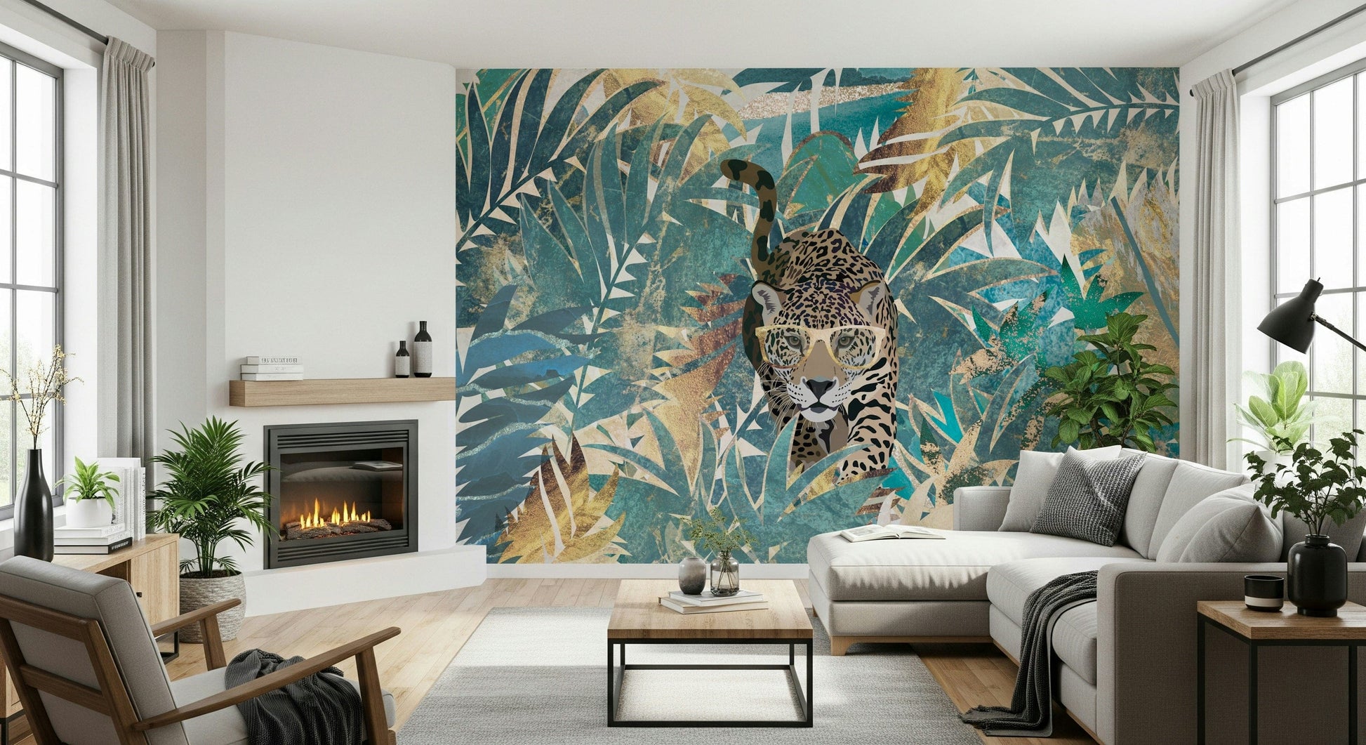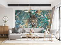 Bring the tropics home with this captivating wallpaper for walls. A cool jaguar hides amongst lush palm leaves. The art blends teal, gold, and brown tones for a visually appealing design. This peel-and-stick wallpaper transforms interiors, adding a unique focal point. Imagine it in a living room or bedroom, complementing modern decor. Its blend of nature and sophistication makes it ideal for stylish homes. Let this jungle theme bring life and intrigue to your space.