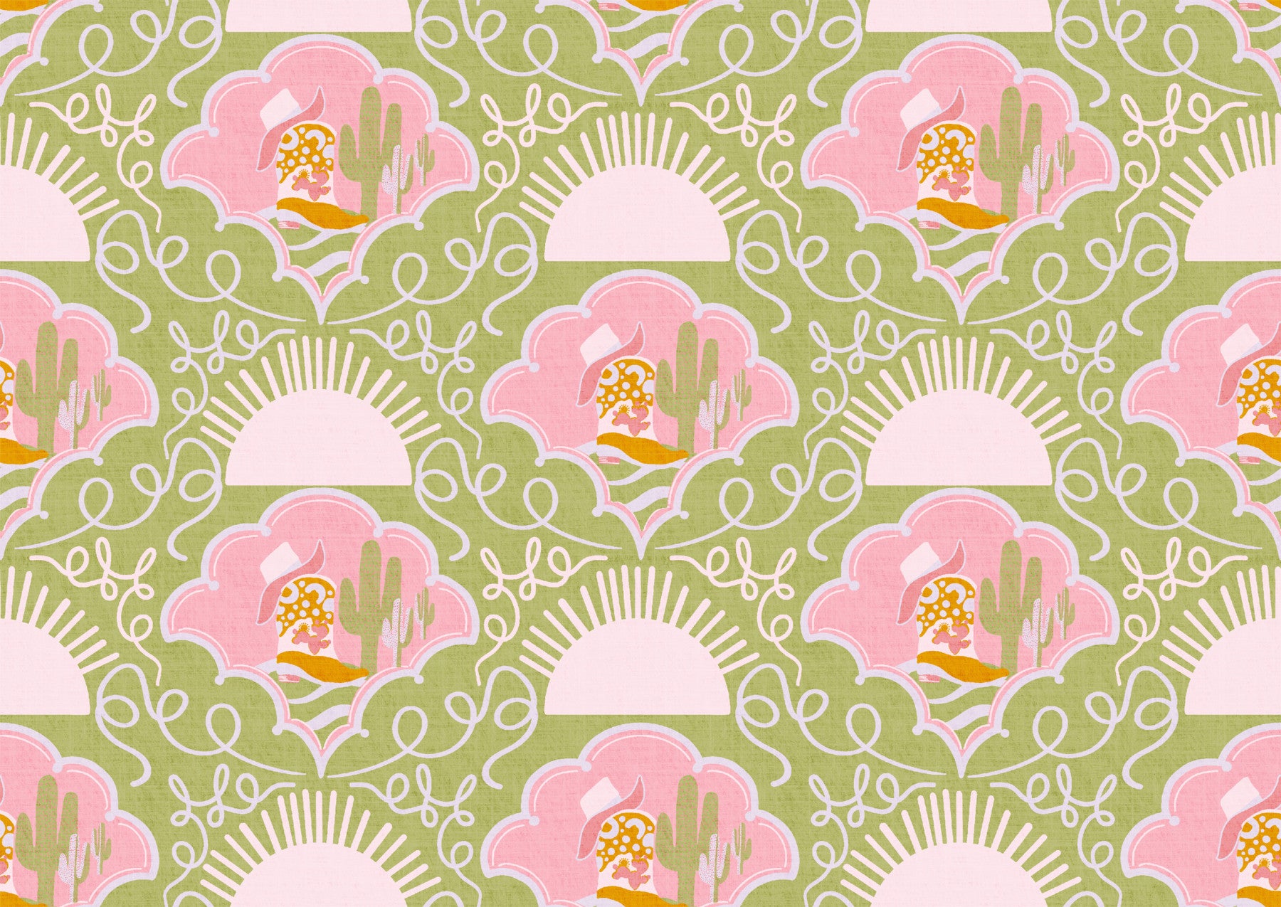 Bring the fun spirit of the Wild West into your space with Wild West Whimsy in a fresh green and pink palette. This hand-drawn wallpaper features a lively mix of cowboy boots, desert cacti, sunbursts, and swirling white lines set against vibrant greenery and dreamy pink skies. The playful contrast of colours adds a cheerful vibe, while the soft tones keep the design calm and inviting. Perfect for nurseries, playrooms, or even a creative home office, this design infuses Southwestern charm with a modern, quirky twist. A joyful wallpaper that makes every wall feel full of character and warmth.
