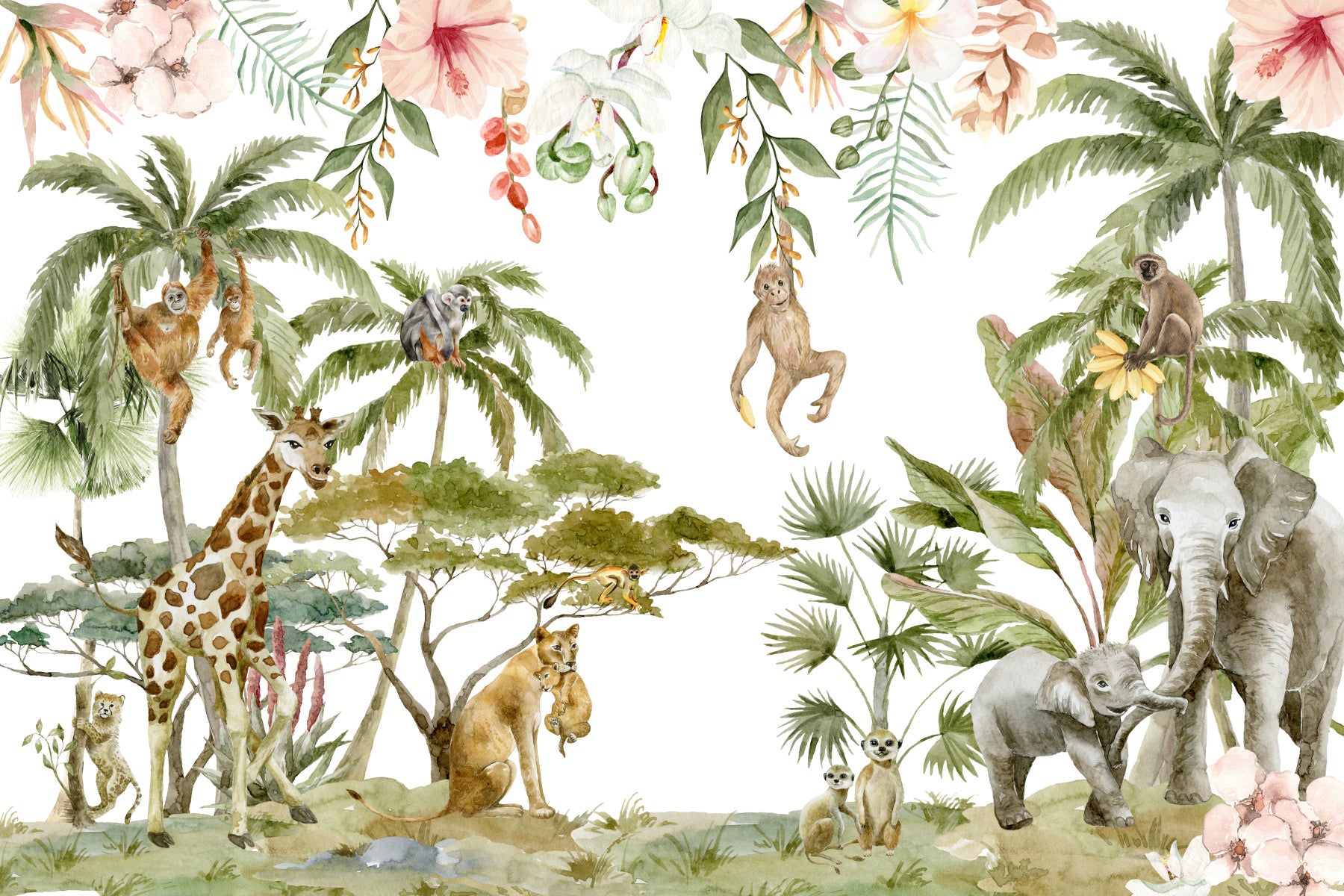 This exquisite watercolor wallpaper brings the magic of the African savanna to life. Intricate details showcase a diverse array of wildlife amidst a vibrant tapestry of tropical flora. From a towering giraffe and playful monkeys to a heartwarming elephant family and a protective lioness, each animal is rendered with stunning realism. The lush greens and earthy browns are complemented by delicate blush pink flowers, creating a harmonious and inviting atmosphere. Perfect for nurseries, bedrooms, or any space needing a touch of exotic charm and peaceful tranquility.