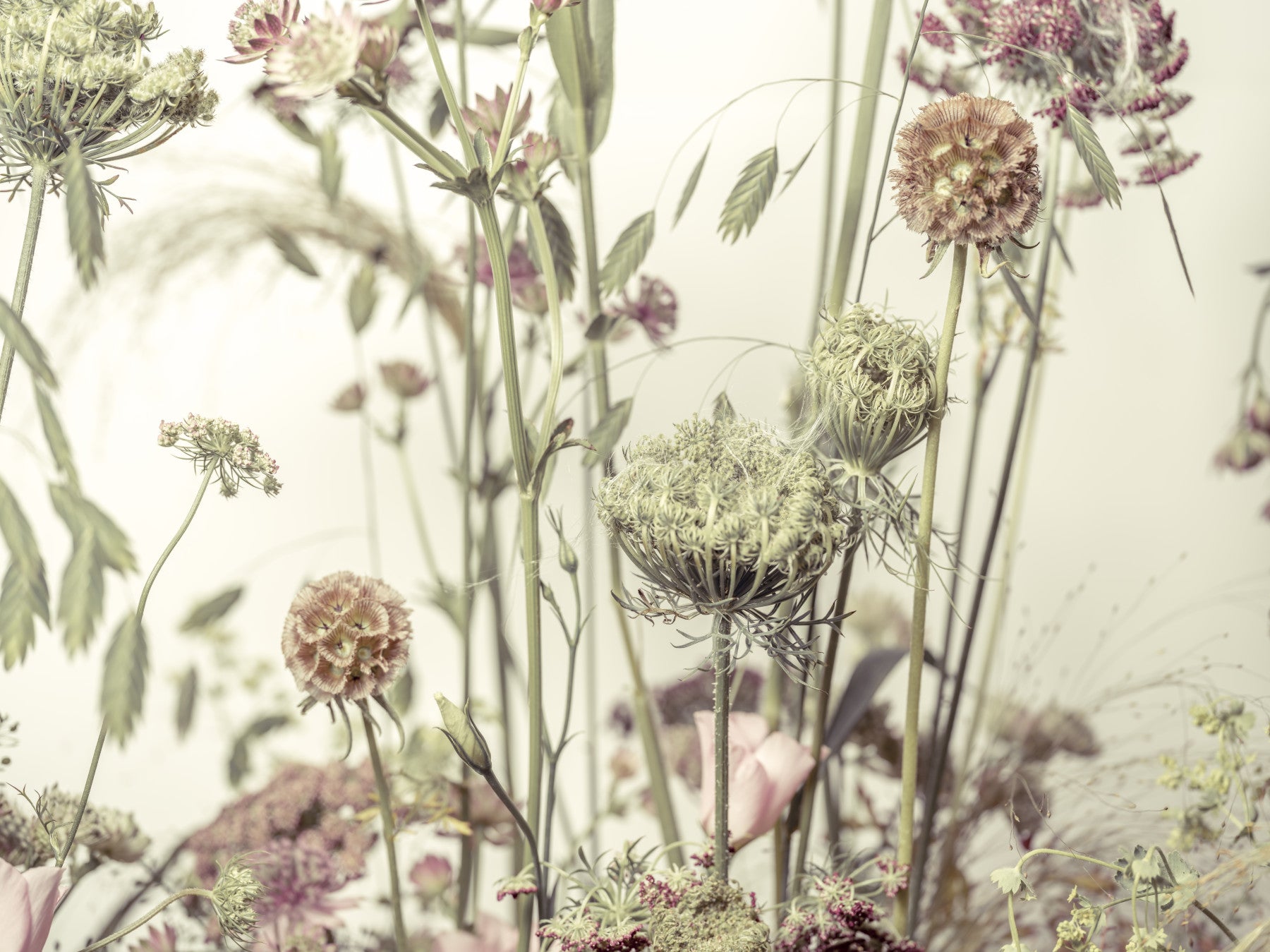 An artistic wildflower bloom mural on minimalist wallpaper.