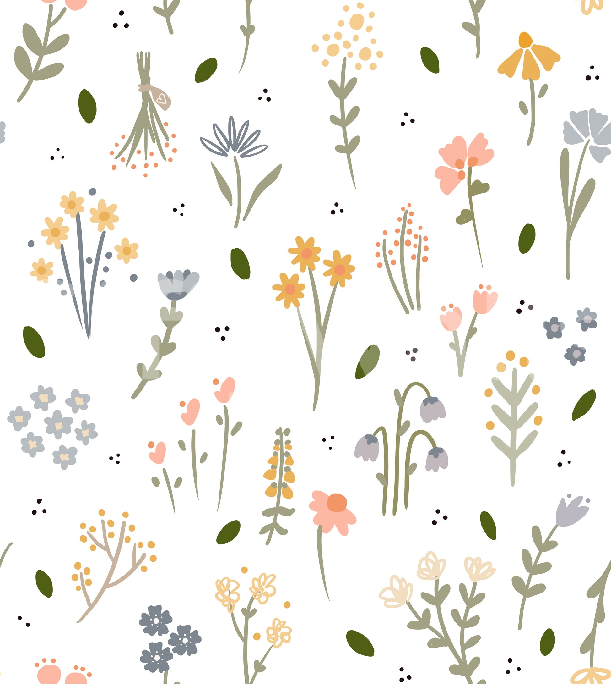 Embrace the gentle beauty of nature with this 'Wildflowers' wallpaper. A charming collection of hand-drawn wildflowers in soft pastel hues and muted greens dances across a clean white background. Delicate blossoms in shades of peach, yellow, and blue, alongside simple foliage and tiny scattered dots, create a whimsical and serene atmosphere. This design evokes a sense of calm and carefree joy, perfect for adding a touch of understated elegance to your digital space. The whimsical, slightly imperfect style lends itself to a relaxed, bohemian aesthetic, bringing a breath of fresh air to any screen.