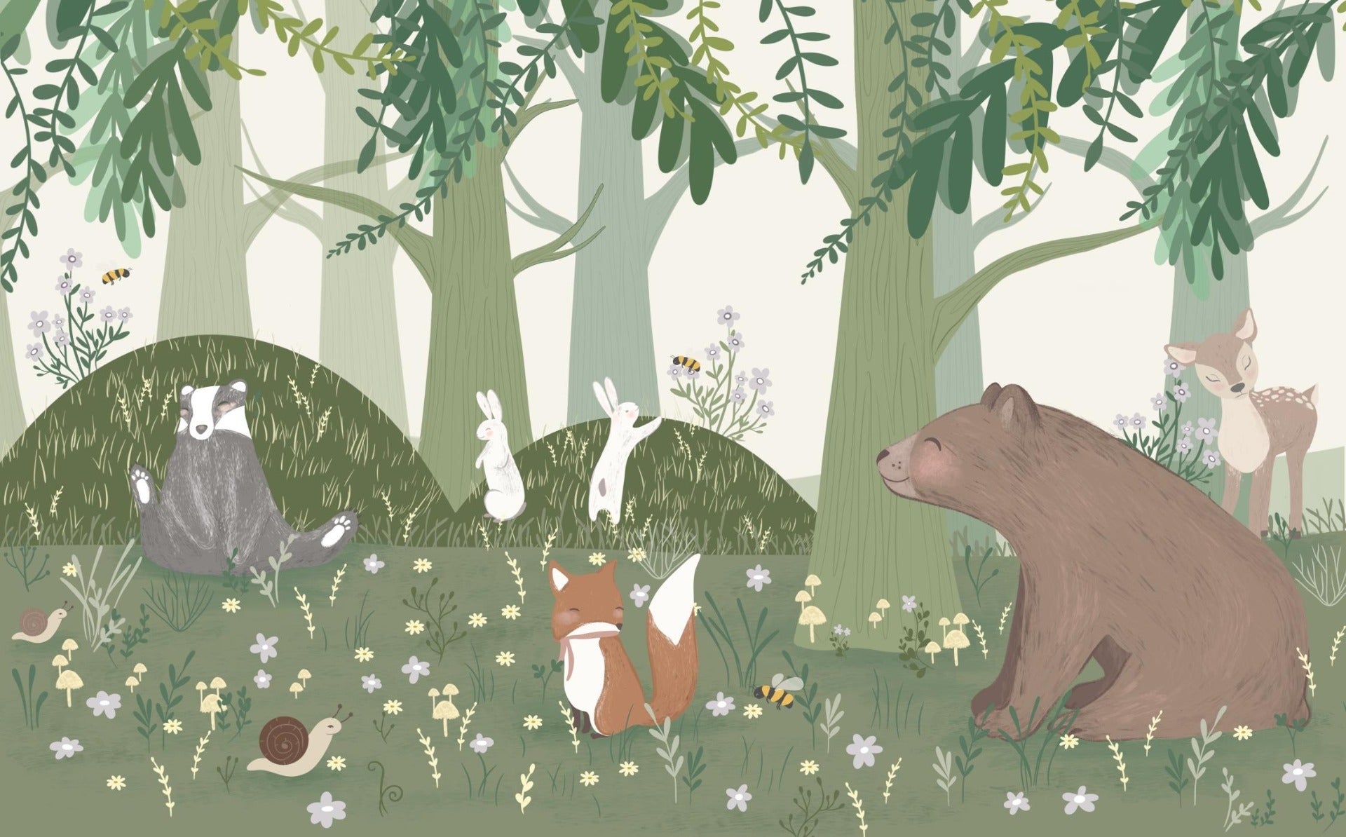 Forest wildlife wallpaper featuring rabbits and bear mural.