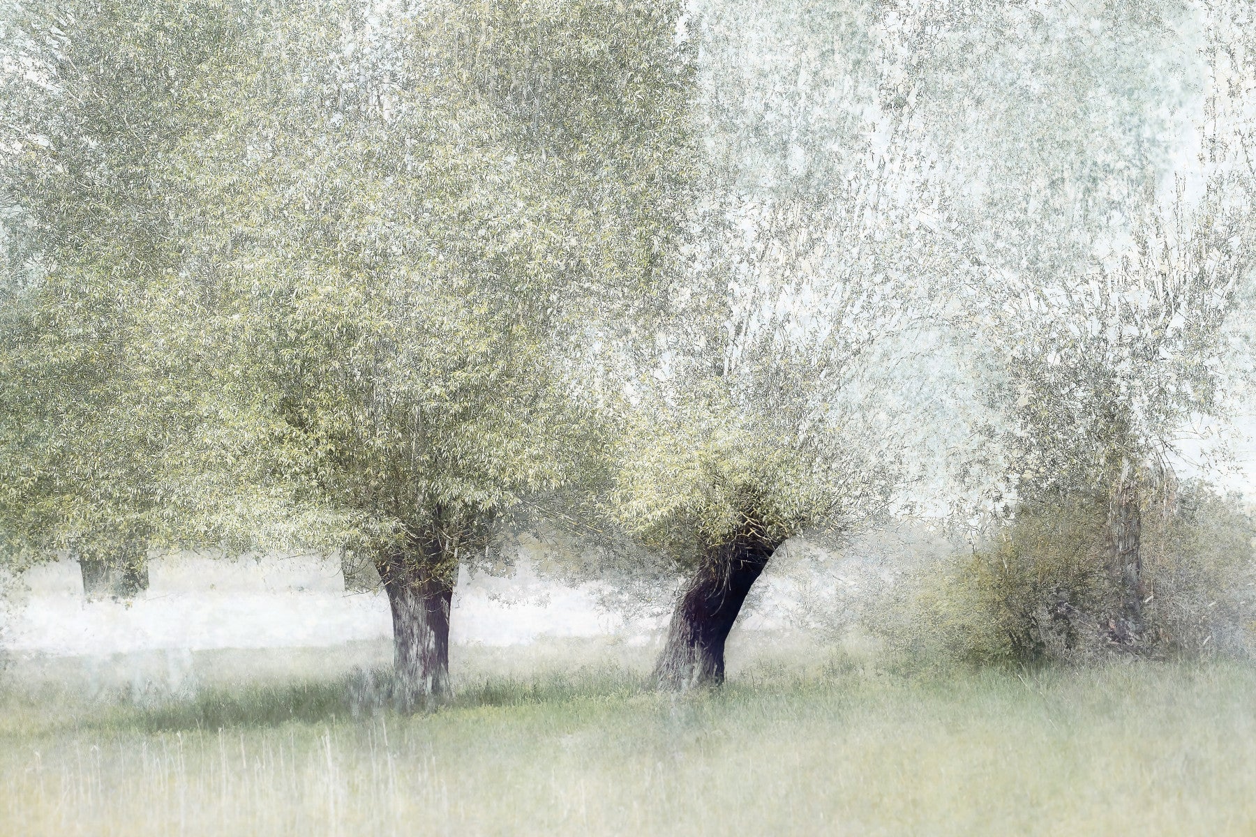 Introduce a calming touch to your home with this woodland-inspired wallpaper. The design showcases gnarled willow trees in a field, rendered in soft, diffused colors. Light greens and hazy browns evoke a peaceful feeling. Consider this wallpaper for walls to enhance bedrooms or studies. The design harmonizes with rustic interiors. It also adds depth to a modern setting. Use this gentle wallpaper to create a quiet haven in your space.