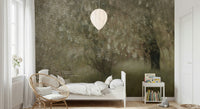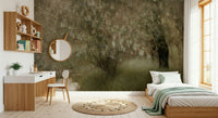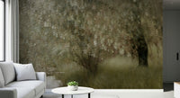 This elegant wallpaper for walls creates a serene escape. The blurred effect highlights light filtering through the willow tree’s slender leaves. Muted greens and browns create a calm atmosphere. It offers a natural vibe that suits living rooms, bedrooms, or hallways. This wallpaper invites the beauty of the outdoors, generating a feeling of peace and understated elegance.