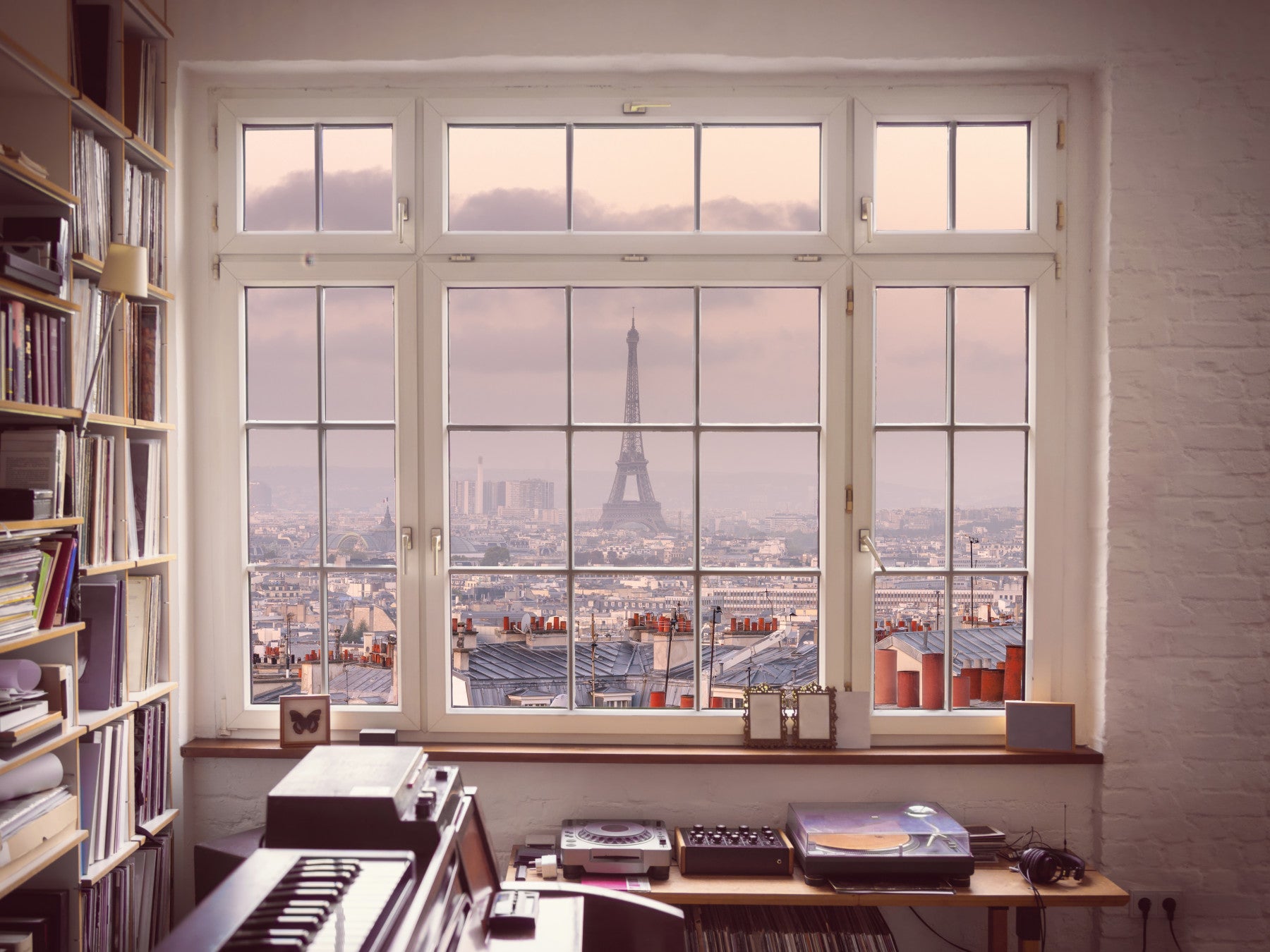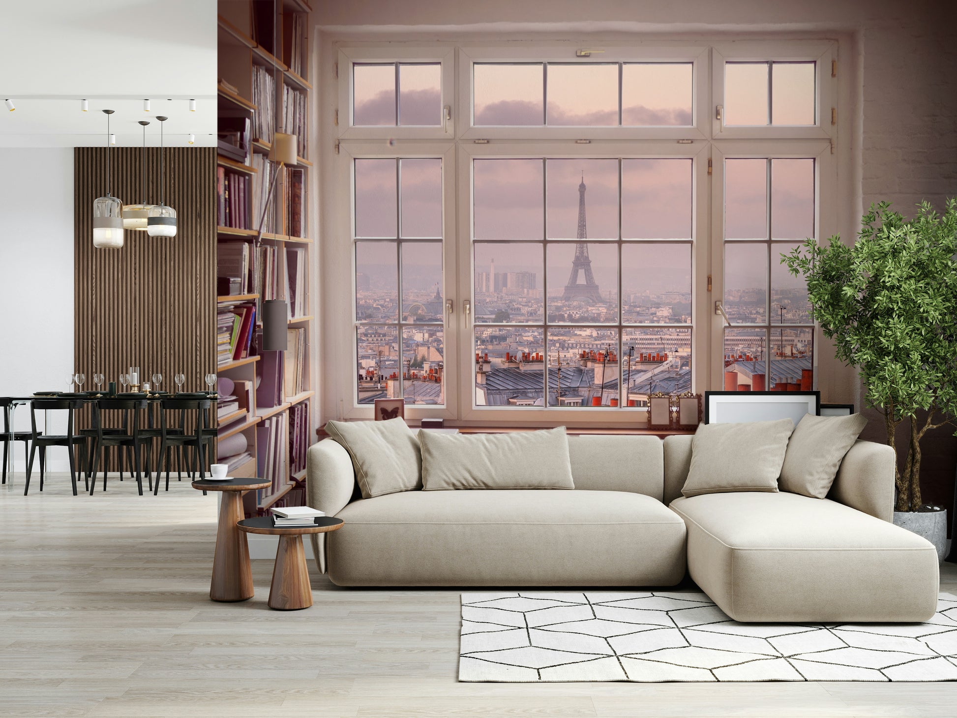 Escape to the city of love with this gorgeous wallpaper. Imagine waking up to a soft pink Parisian sunrise every day! This wallpaper for walls shows a breathtaking view of Paris from a window. The subtle blush and grey tones provide a gentle, calming effect. Perfect for a bedroom, study, or even a hallway, this design adds a touch of Parisian chic and a feeling of openness to any interior. It's a dream for travel lovers and those seeking a touch of romance.
