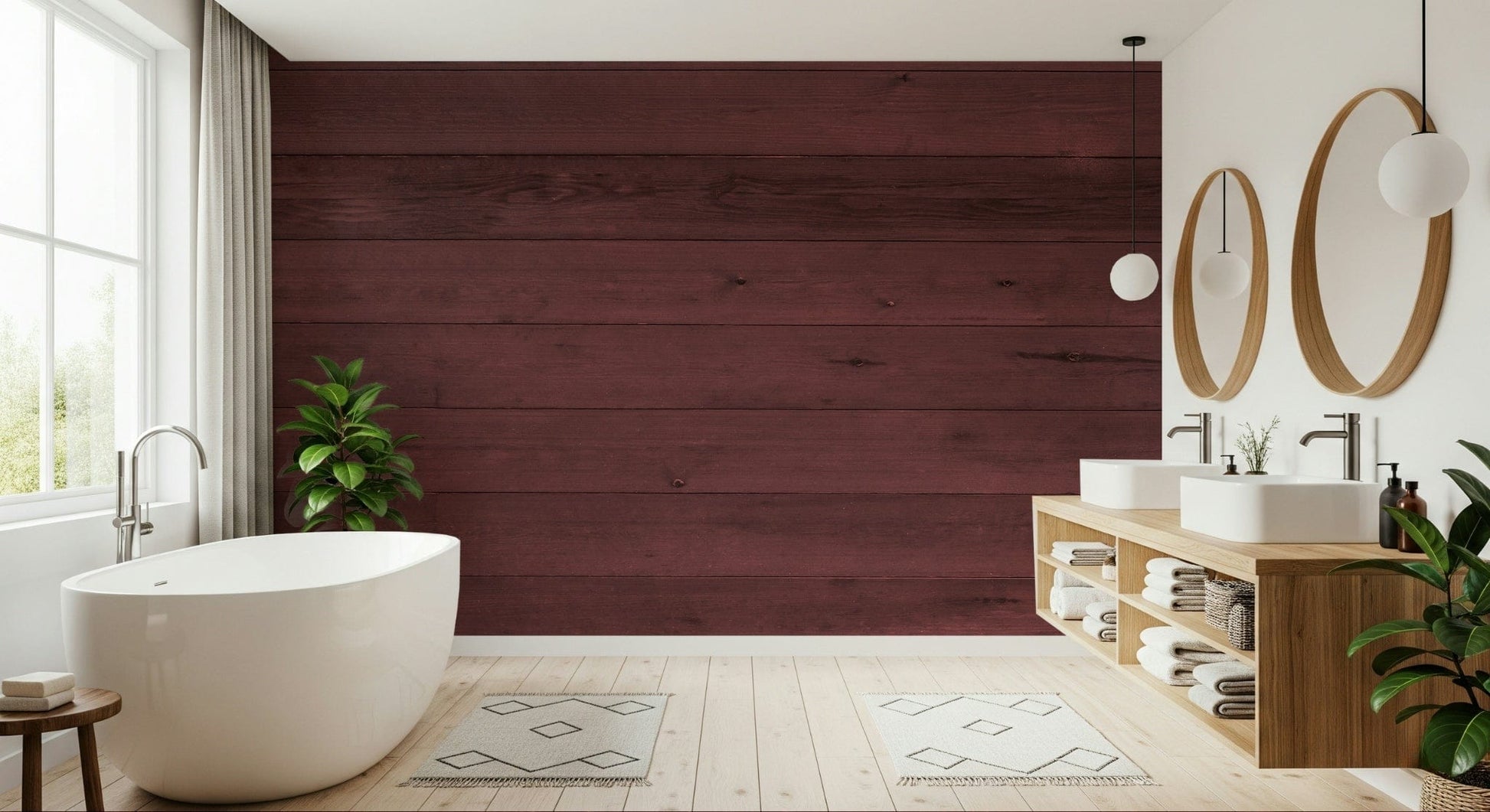 Introduce rustic elegance with this wine-stained wood plank wallpaper. The deep burgundy hue creates a warm, inviting atmosphere in any room. The horizontal plank design adds depth and texture. Elevate your living room, bedroom, or dining space with this refined, rustic touch. This wallpaper for walls integrates seamlessly with contemporary or farmhouse designs, enhancing your home with its rich colour and wood grain detail.