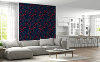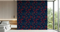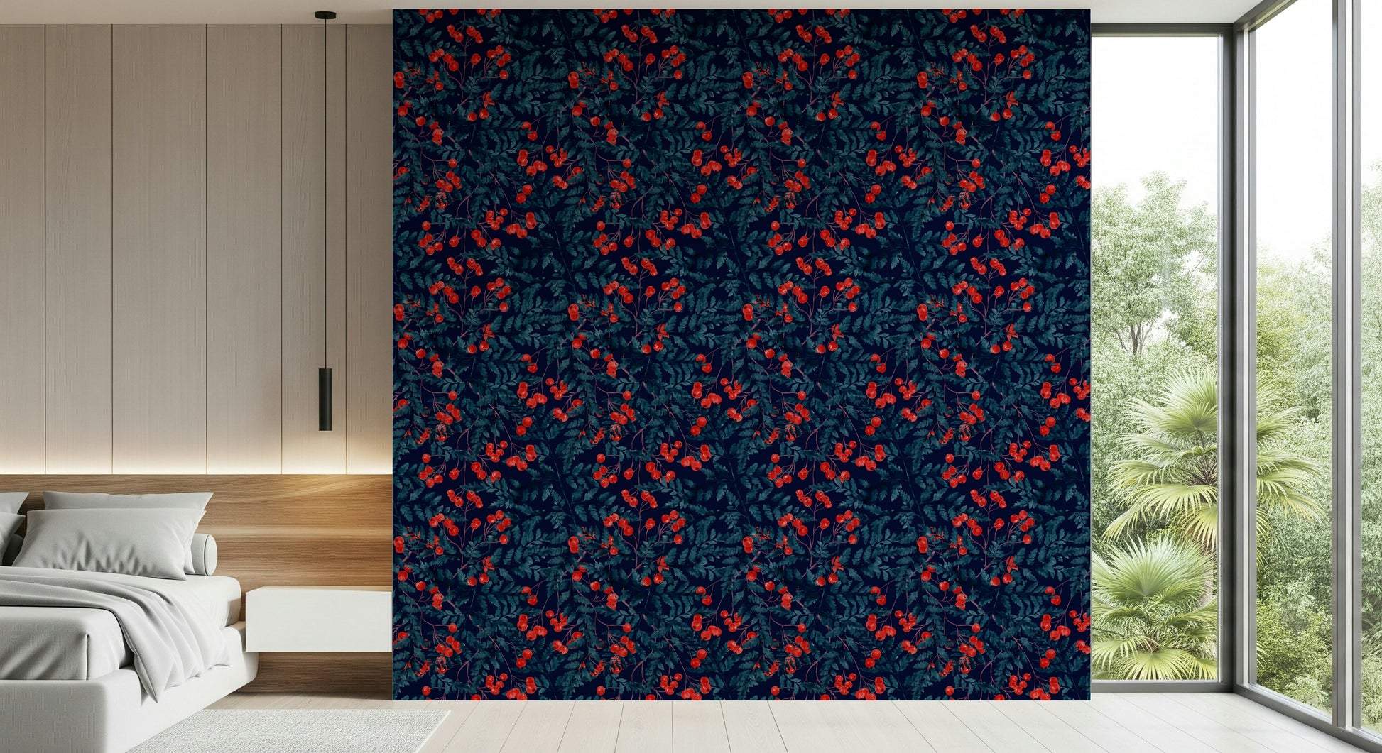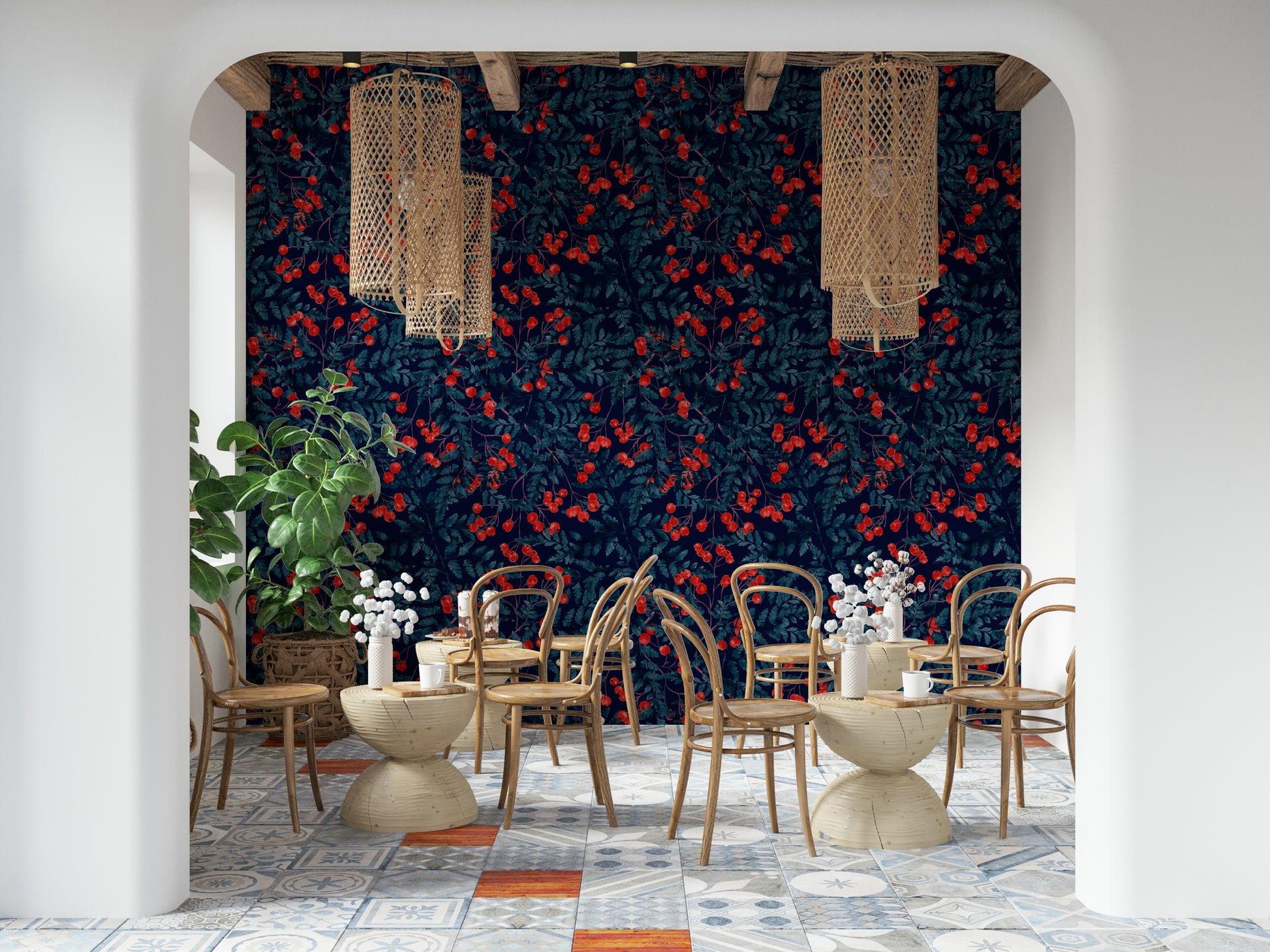 Bring the beauty of winter indoors with this sophisticated botanical wallpaper for walls. Dark teal foliage contrasts beautifully against the bright red berries, creating a rich and inviting pattern. The watercolour style provides a soft, artistic touch that will elevate any room. Consider this design for your living room, dining room, or bedroom to create a cosy and stylish space. It brings a touch of nature and elegance to your home. The intricate detail enhances and complements interior spaces, adding depth and dimension.