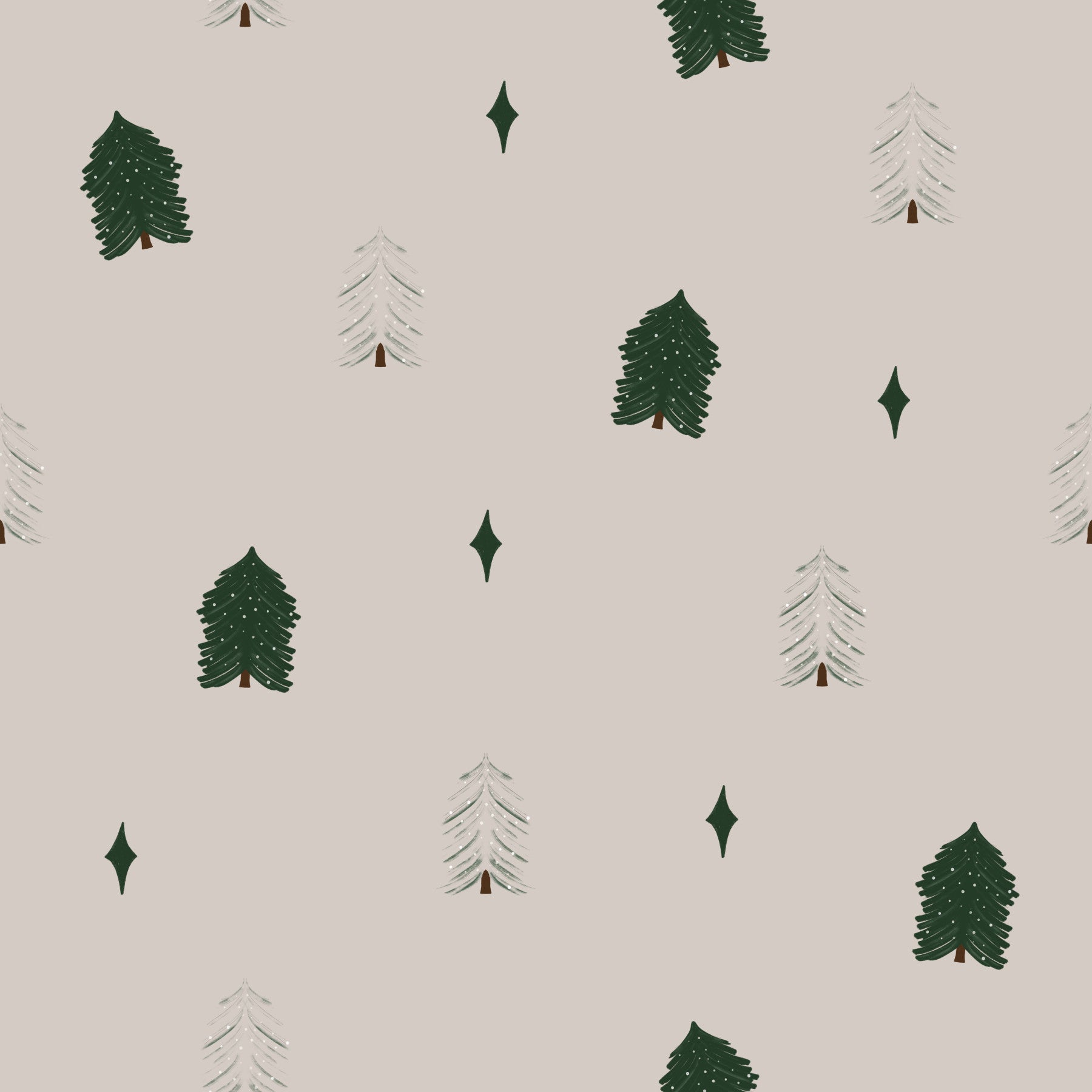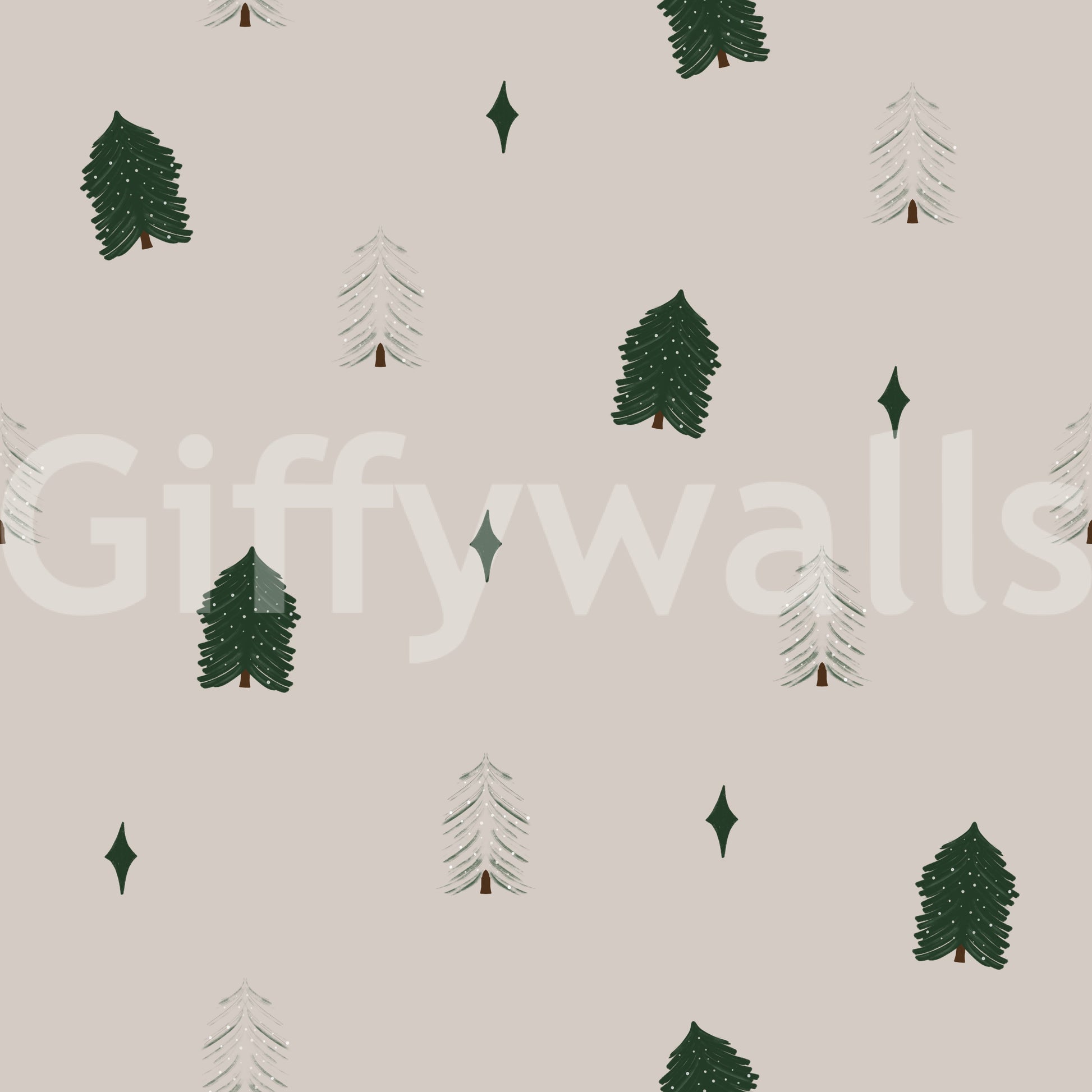 Embrace the quiet beauty of winter with this charming tree pattern. Dark green and light green conifers with snowfall mingle with diamond shaped elements against a neutral background. This wallpaper for walls brings a touch of the serene forest into your home. Its gentle colour palette works wonders in a bedroom, living room, or even a cosy reading nook. Let the calming design transform your space into a peaceful escape.