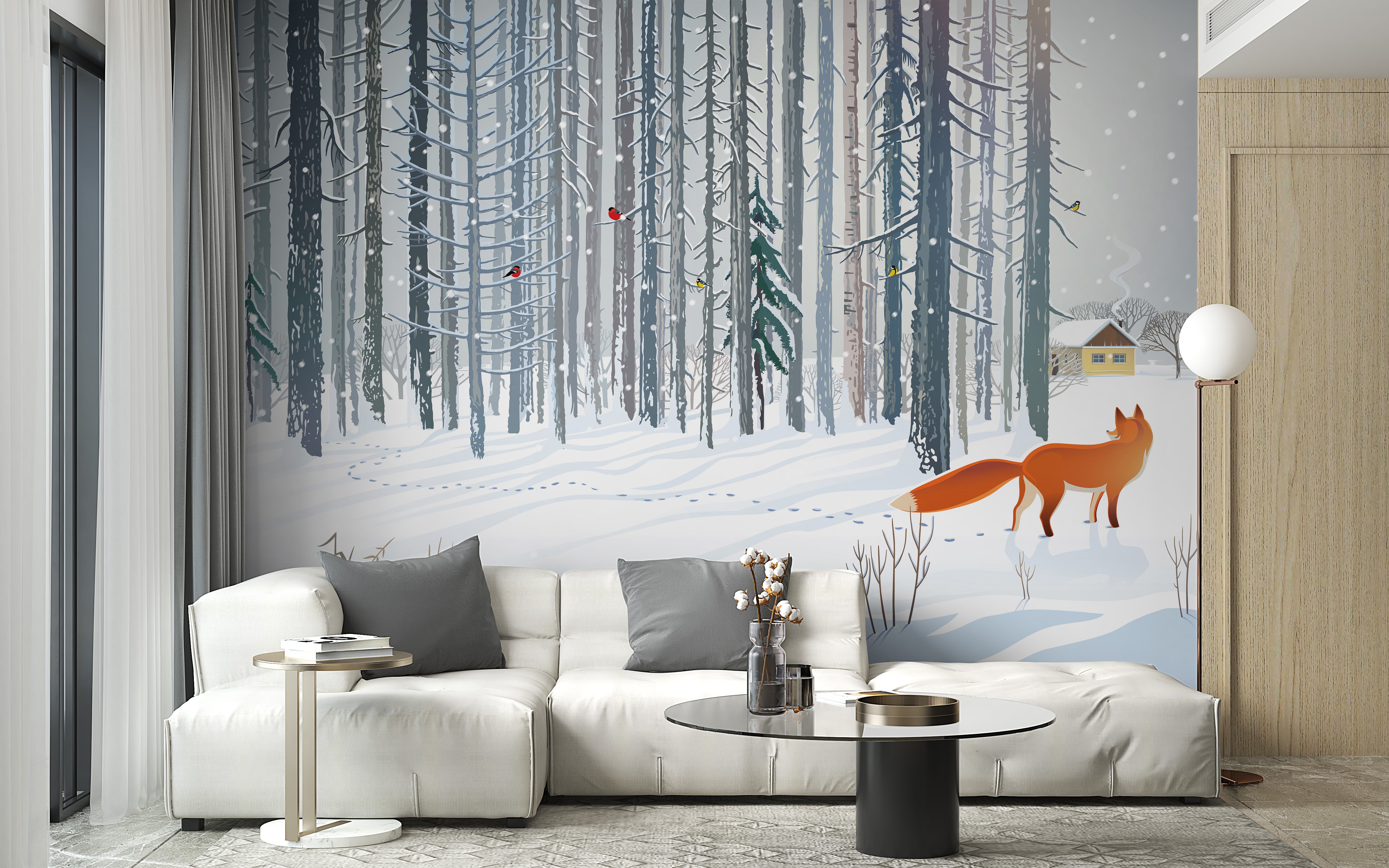 Peaceful winter forest fox mural for living rooms