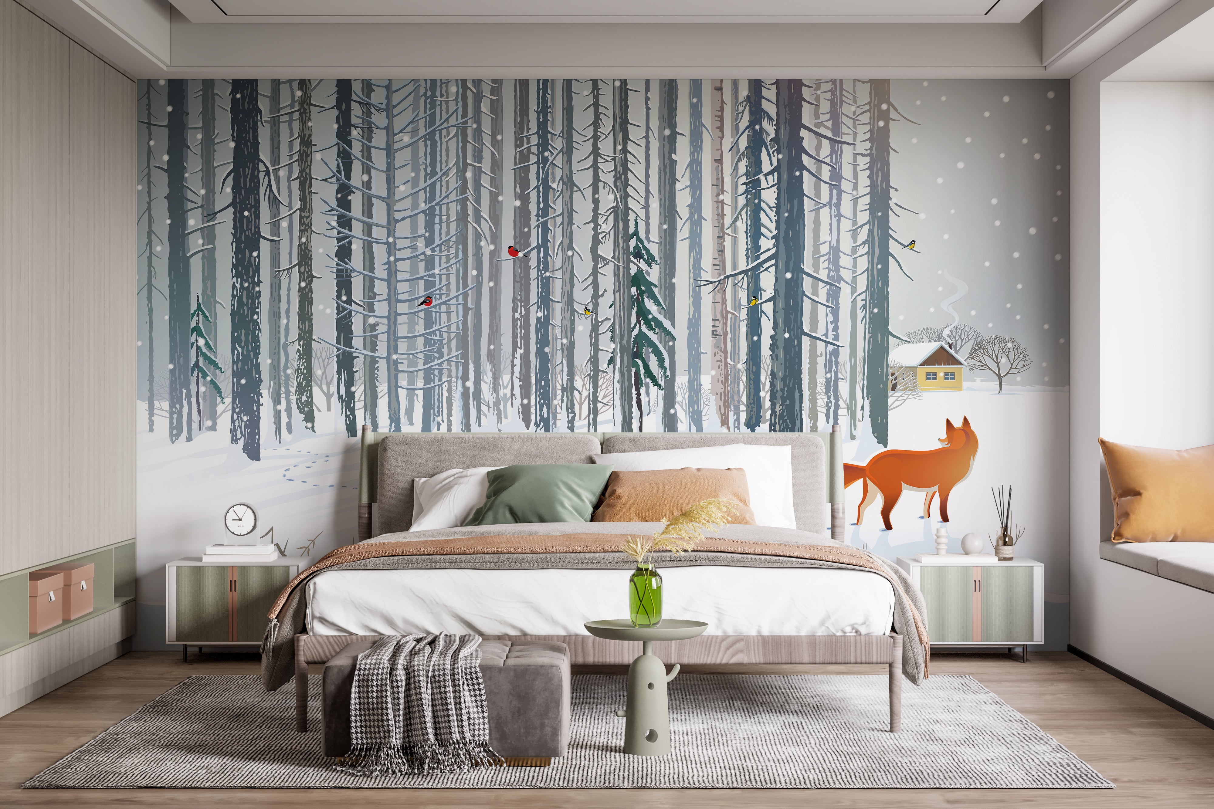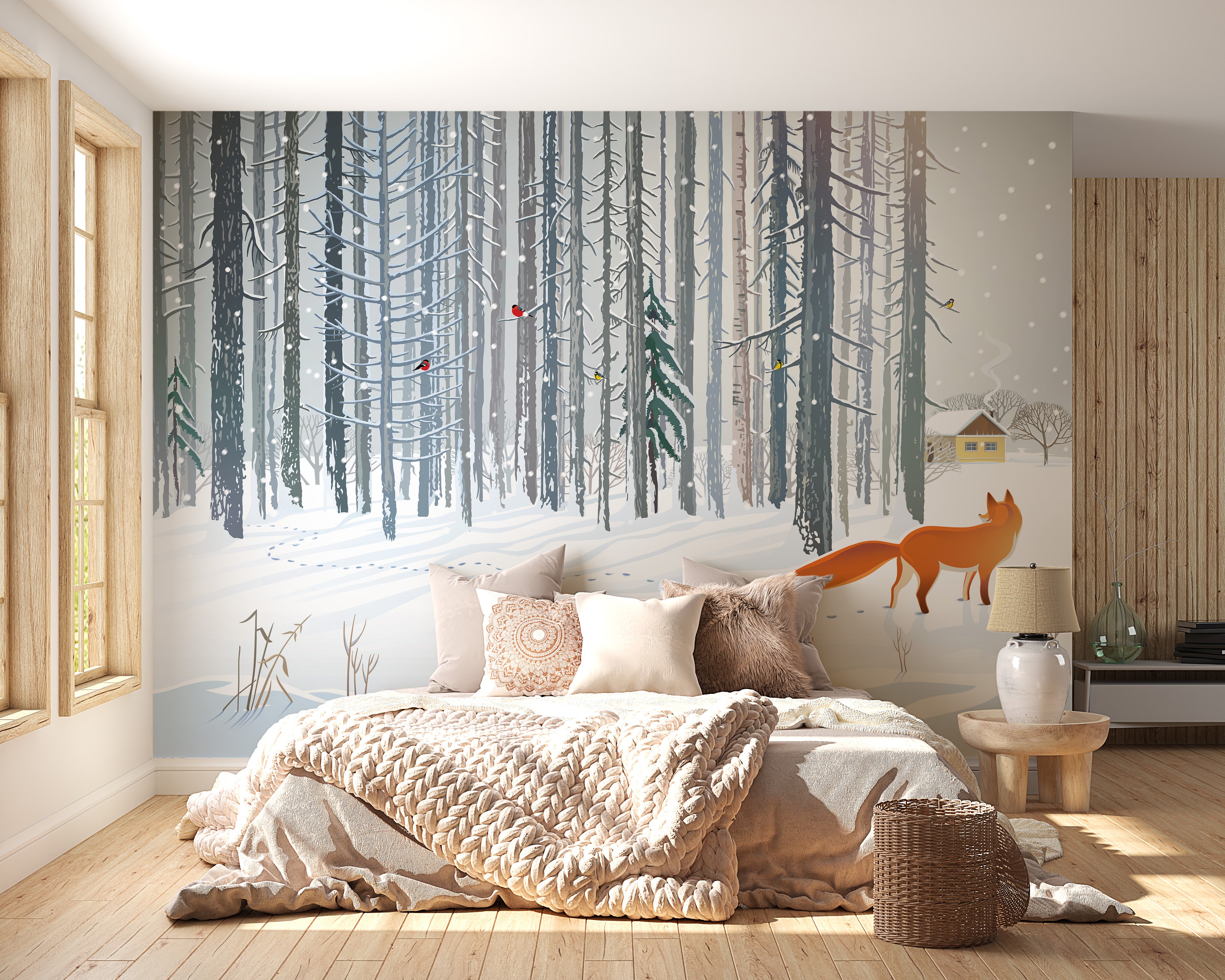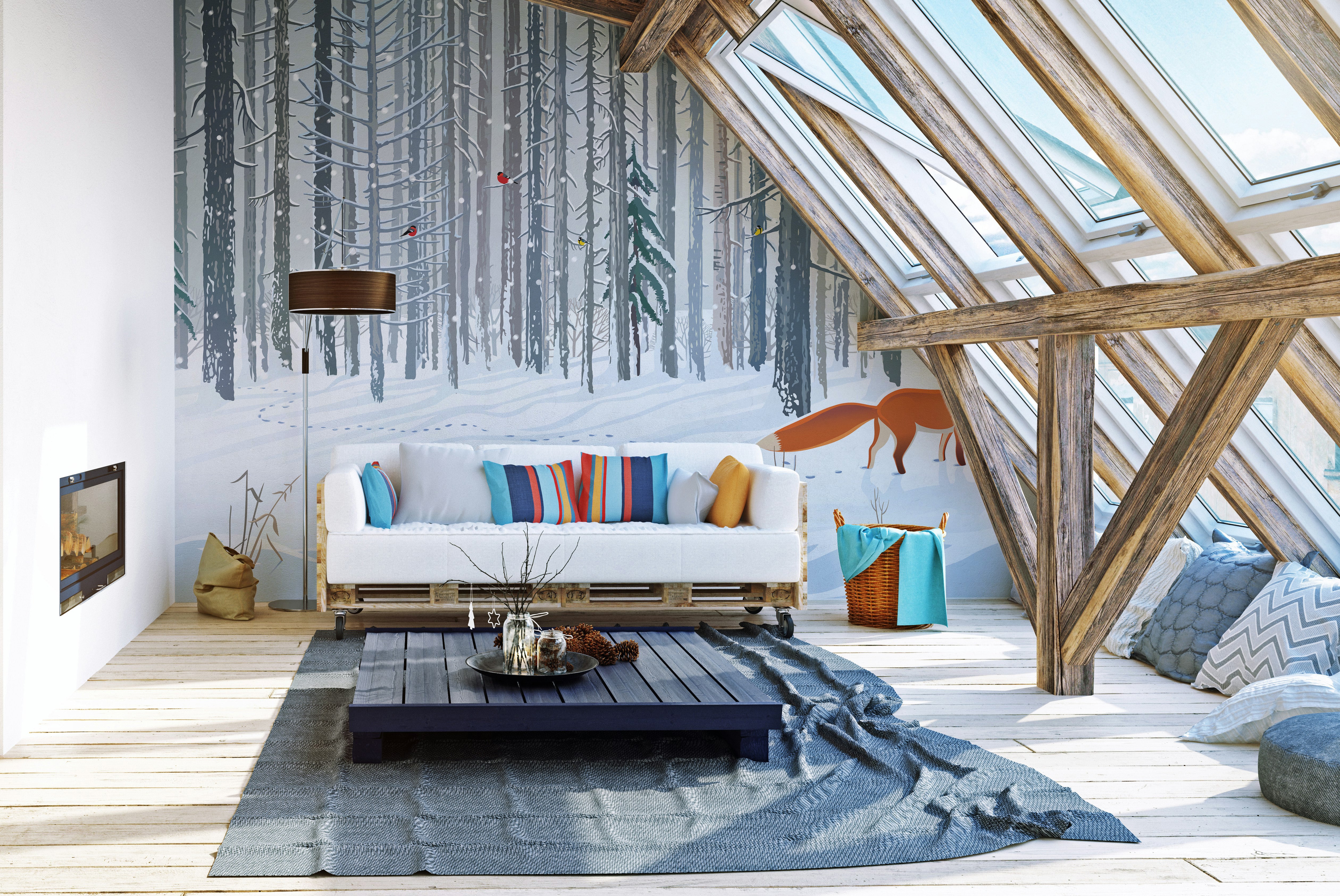 Winter forest fox mural for walls