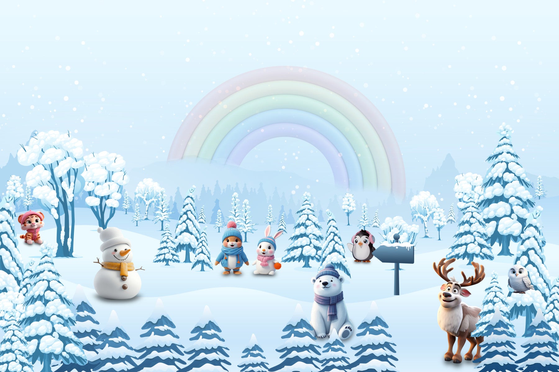 Kids playroom wall with winter friends rainbow mural, modern décor.