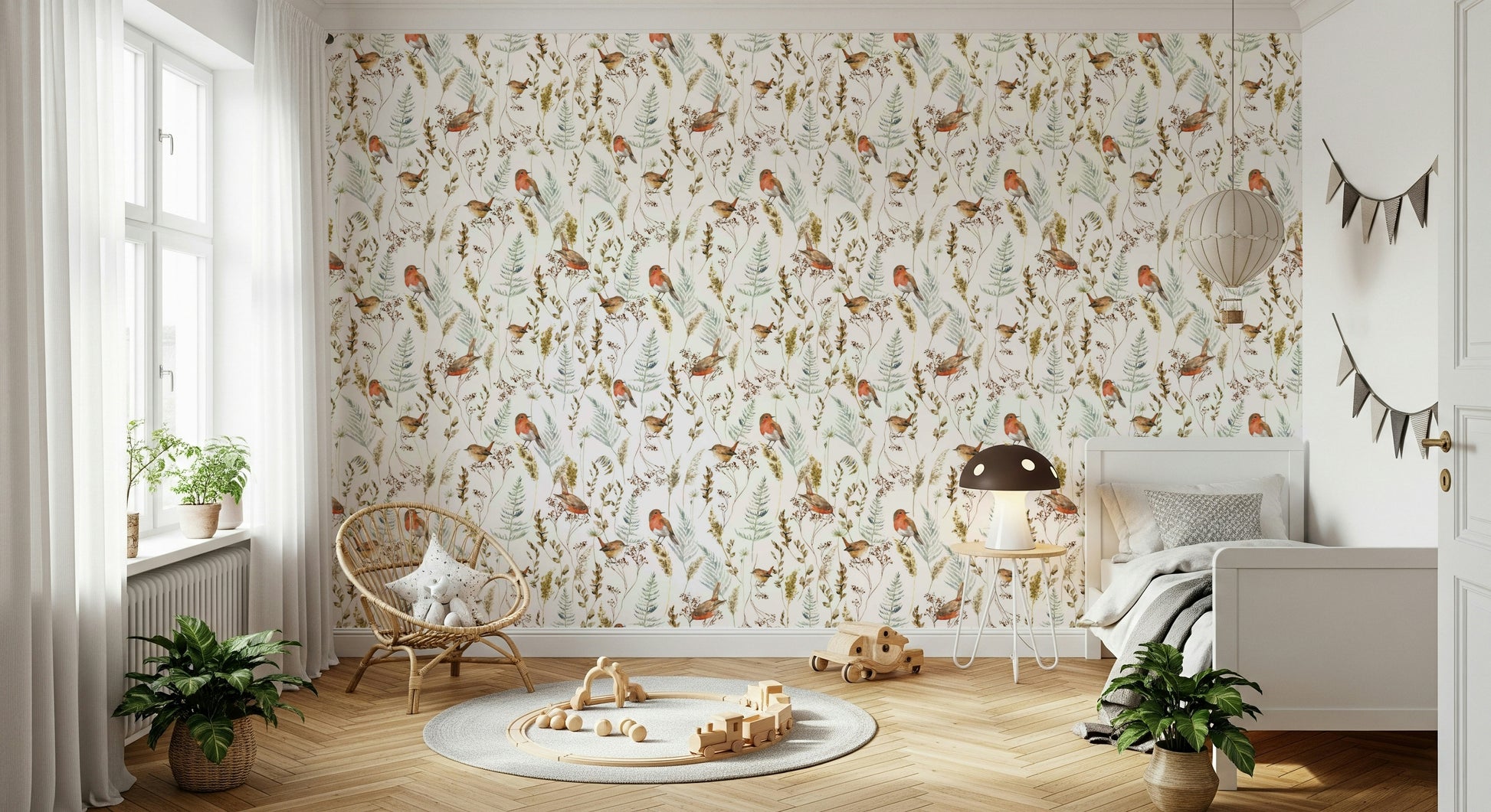 Bring a touch of winter's quiet beauty into your home with this enchanting wallpaper by Uta Naumann. A soft, watercolour design features charming robins perched among delicate foliage in muted browns and greens. The gentle brushstrokes and natural elements create a serene, calming effect, perfect for a bedroom or living room. Install this wallpaper for walls to instantly refresh your space with a touch of nature's elegance. This design offers a subtle yet sophisticated style that complements a wide variety of interior decor, from modern farmhouse to classic styles. It invites warmth and tranquility into your everyday life.