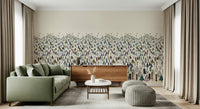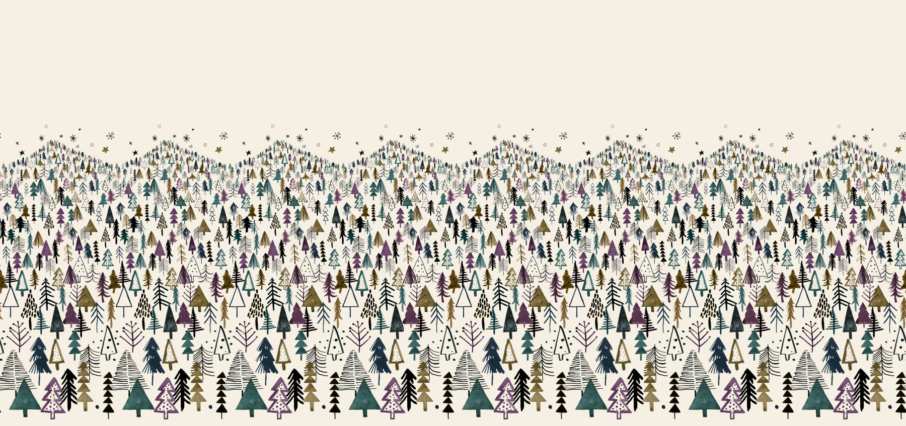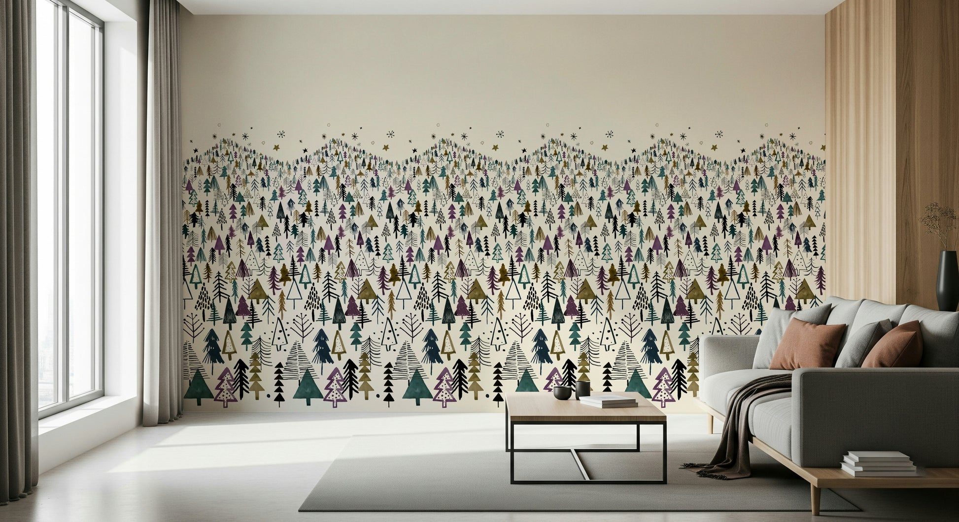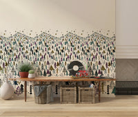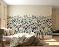 Welcome a serene winter wonderland into your home with this unique tree-themed wallpaper. Ideal as wallpaper for walls, it showcases a dense forest of stylized trees in a palette of muted greens, purples, and browns against a creamy backdrop. The whimsical design captures a childlike sense of wonder, making it a charming addition to kids' rooms, nurseries, or playrooms. Its detailed illustration style adds a touch of artistry, while the soft hues create a calming ambiance. This design enhances interior spaces by introducing a playful element with a clean, understated aesthetic. It complements both modern and traditional décor.