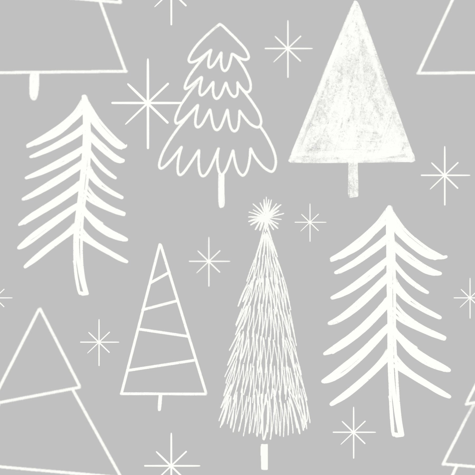A gentle gray wallpaper featuring playful sketched evergreens and star shapes.