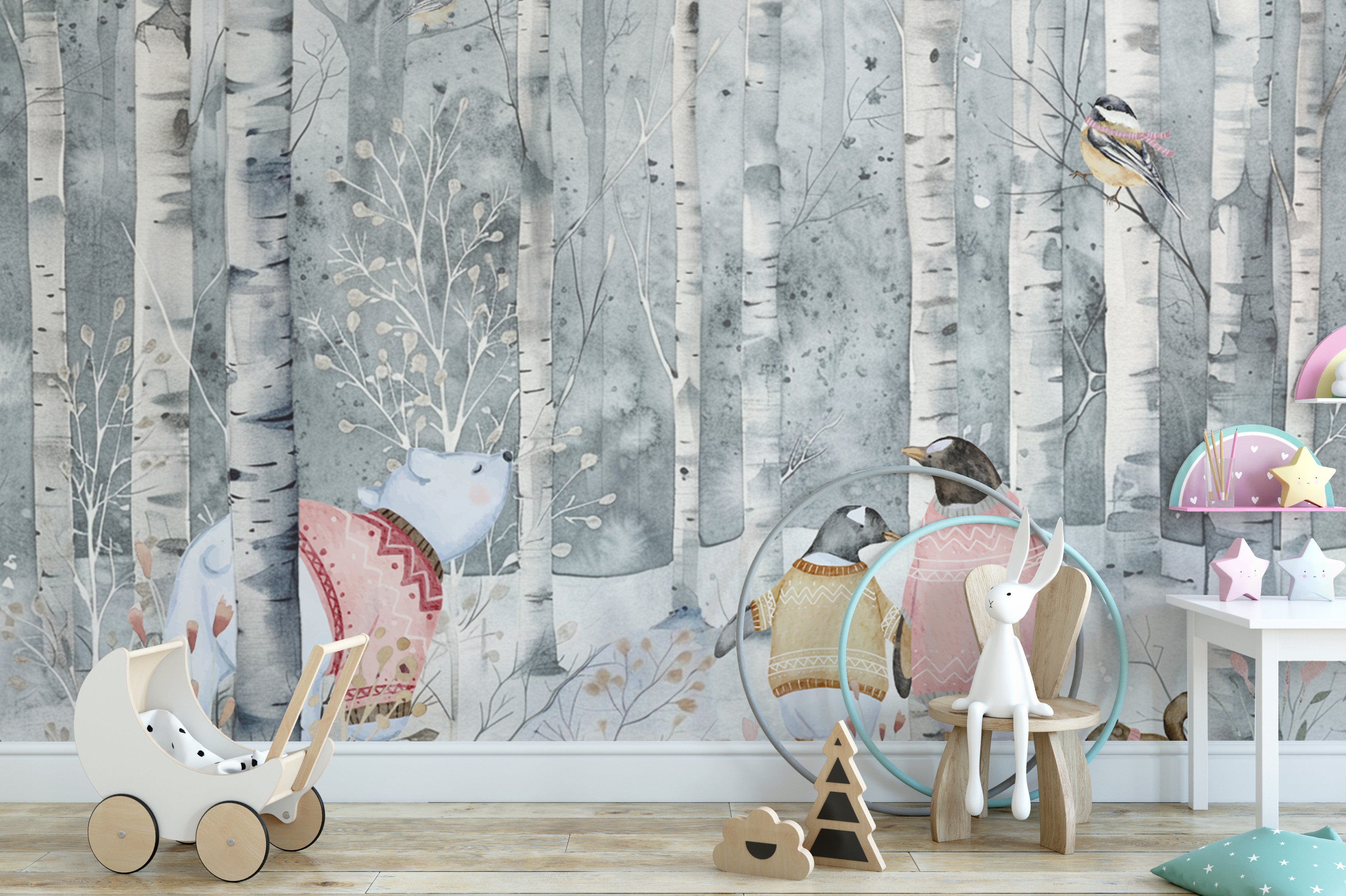 The winter woodland animal mural features a charming watercolor wonderland mural with penguins, a polar bear, and a squirrel dressed in cozy sweaters. The Scandinavian forest mural highlights delicate birch trees and soft pastel tones, creating a peaceful setting. This whimsical snowy forest wallpaper brings warmth and charm to nurseries, kids' rooms, and cozy living spaces. The Nordic birch tree wallpaper adds a gentle touch of nature with hand-drawn details and soothing hues. The cute animal illustration mural captures the magic of winter, making it an ideal choice for those who love enchanting and nature-inspired interiors.
