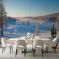 Bring the peace of a winter landscape inside. The design showcases snow-covered trees under a clear, pastel sky. Soft light gives the scene a tranquil feeling. This wallpaper for walls transforms any room into a serene escape. Its gentle colours and natural theme work wonderfully in bedrooms, living rooms, or even a home office. It adds a touch of quiet sophistication and opens up your space with its expansive vista.