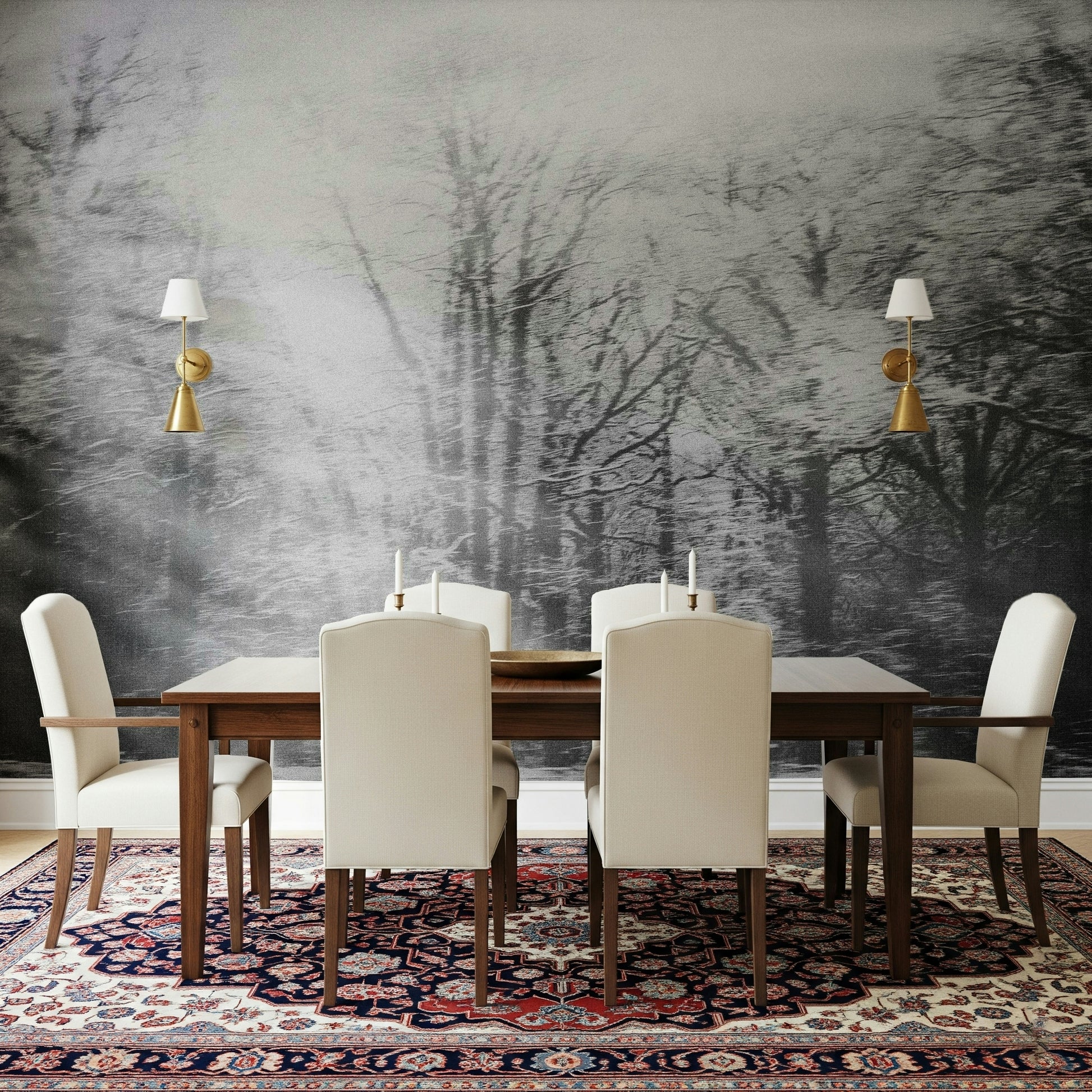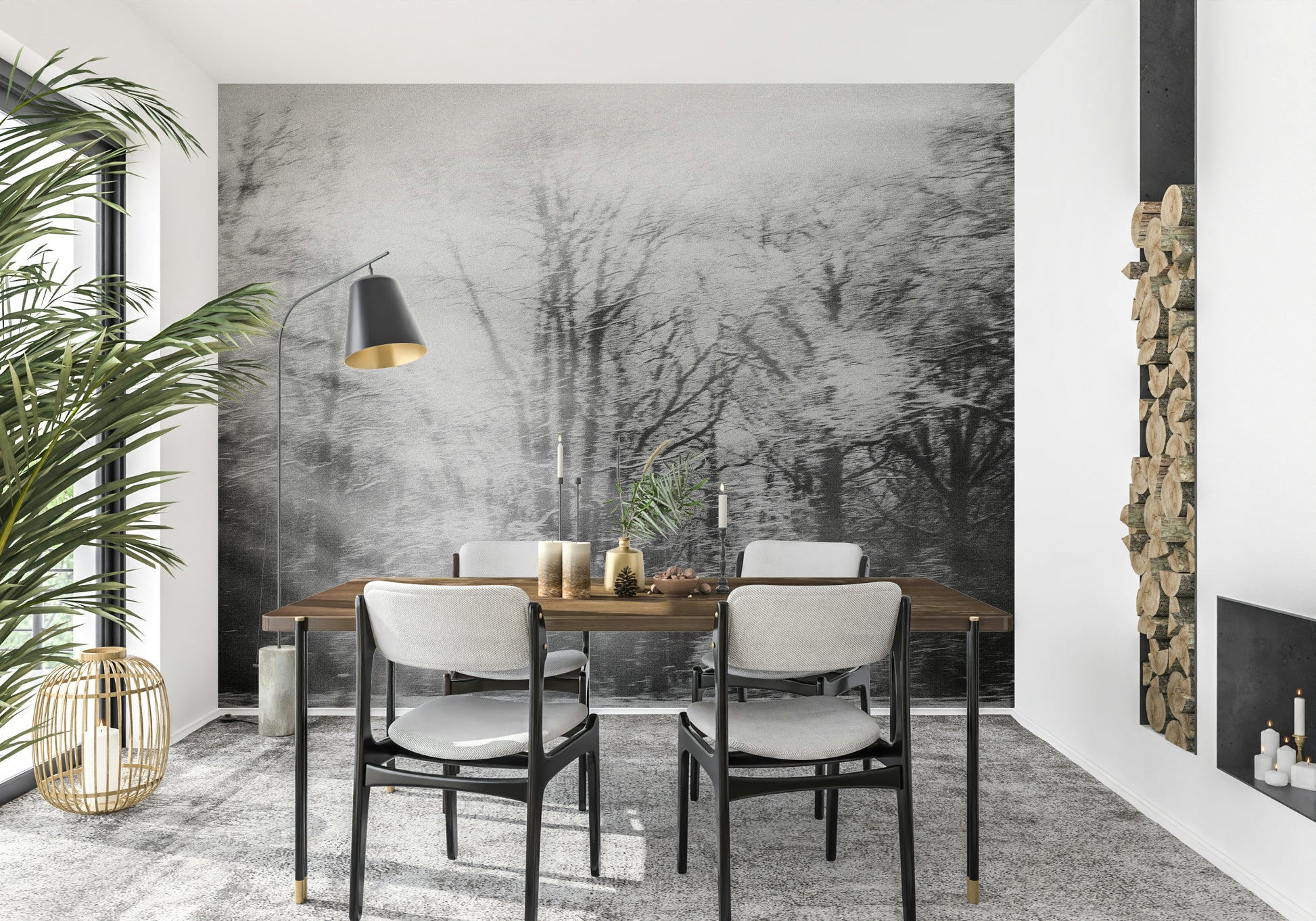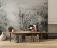 Transform your space with this black and white forest scene. The image captures the ethereal beauty of winter woods. This design is suited for creating a calm atmosphere in bedrooms, hallways, or home offices. The monochrome palette complements minimalist and modern decor styles. Bring nature inside with this stylish wallpaper for walls that introduces a tranquil touch to interiors.