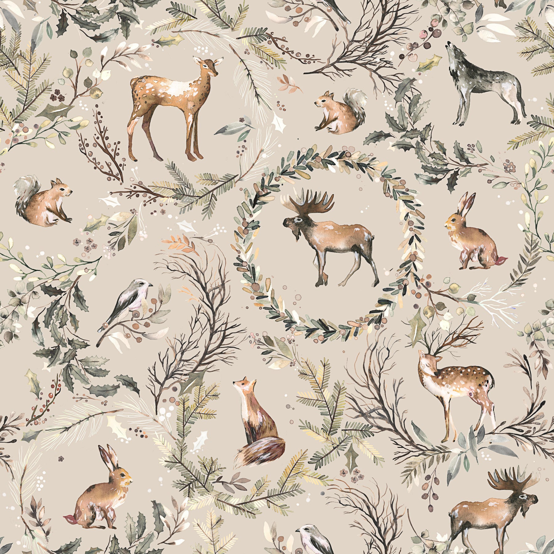 Embrace the serene beauty of the woodland with this enchanting wallpaper. Delicate watercolor illustrations depict a charming cast of woodland creatures – graceful deer, cunning foxes, playful squirrels, and gentle rabbits – nestled amongst a whimsical array of winter flora. Subtle muted tones of beige, greens, and browns create a calming atmosphere, perfect for adding a touch of rustic elegance to any space. The intricate details of the foliage and animals bring a sense of tranquility and natural wonder to your screen, transforming it into a peaceful woodland retreat. This wallpaper is an exquisite blend of artistry and nature, capturing the essence of a serene winter wonderland.