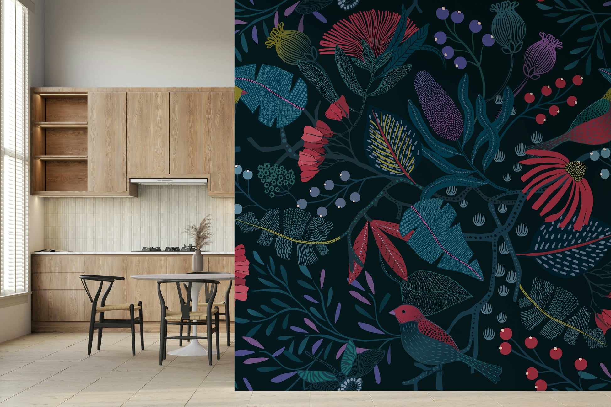 Escape into the enchanting depths of 'Wonderforest,' a captivating wallcovering that brings a touch of whimsical wilderness to your living space. Immerse yourself in a tapestry of stylised flora and fauna, where vivid blossoms and textured leaves intertwine against a rich, twilight-hued backdrop. Discover charming, stylised birds perched amidst branches laden with colourful berries, creating a sense of hidden life and serene harmony. The intricate details and sophisticated colour palette create an atmosphere of both elegance and mystery, transforming any room into a haven of natural beauty. Invite the tranquil allure of a hidden garden into your home, where every glance reveals a new detail within this mesmerizing botanical scene.