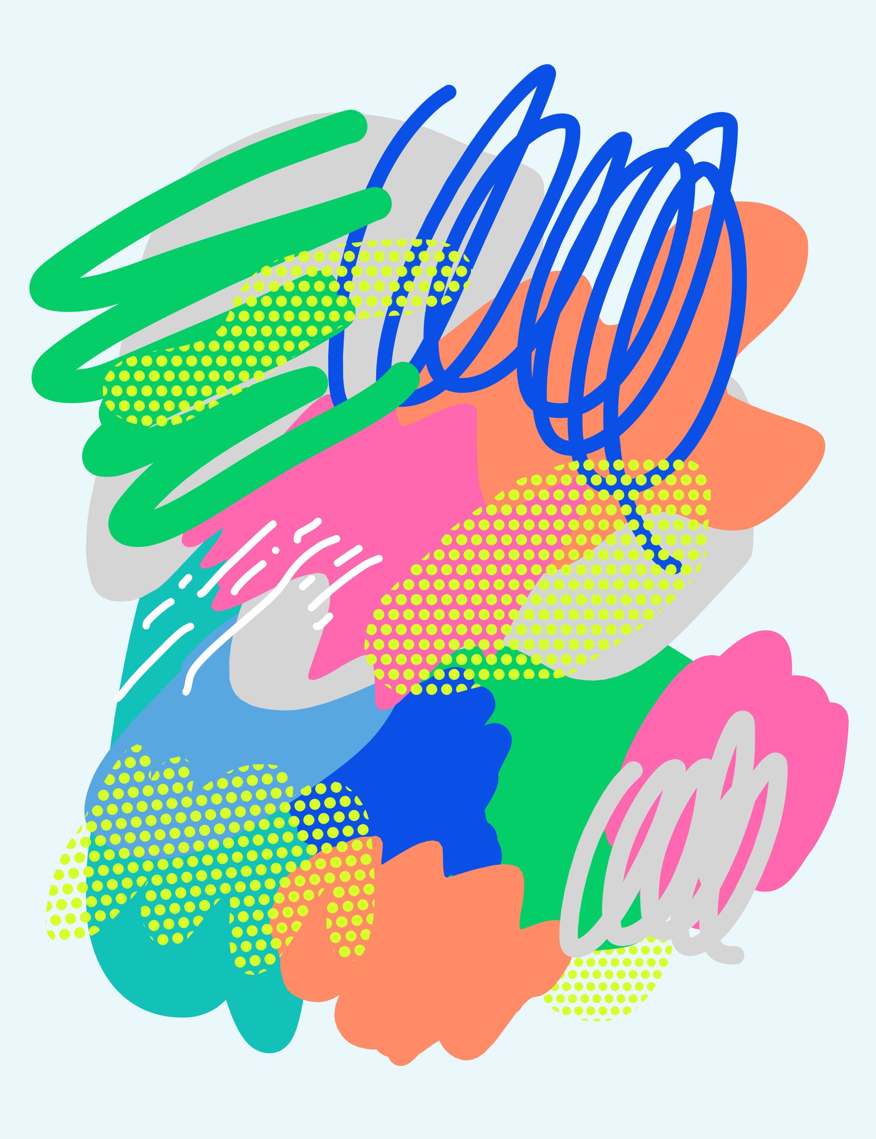 A playful wallpaper with neon brushstrokes, swirling lines, and dotted textures in bold hues.