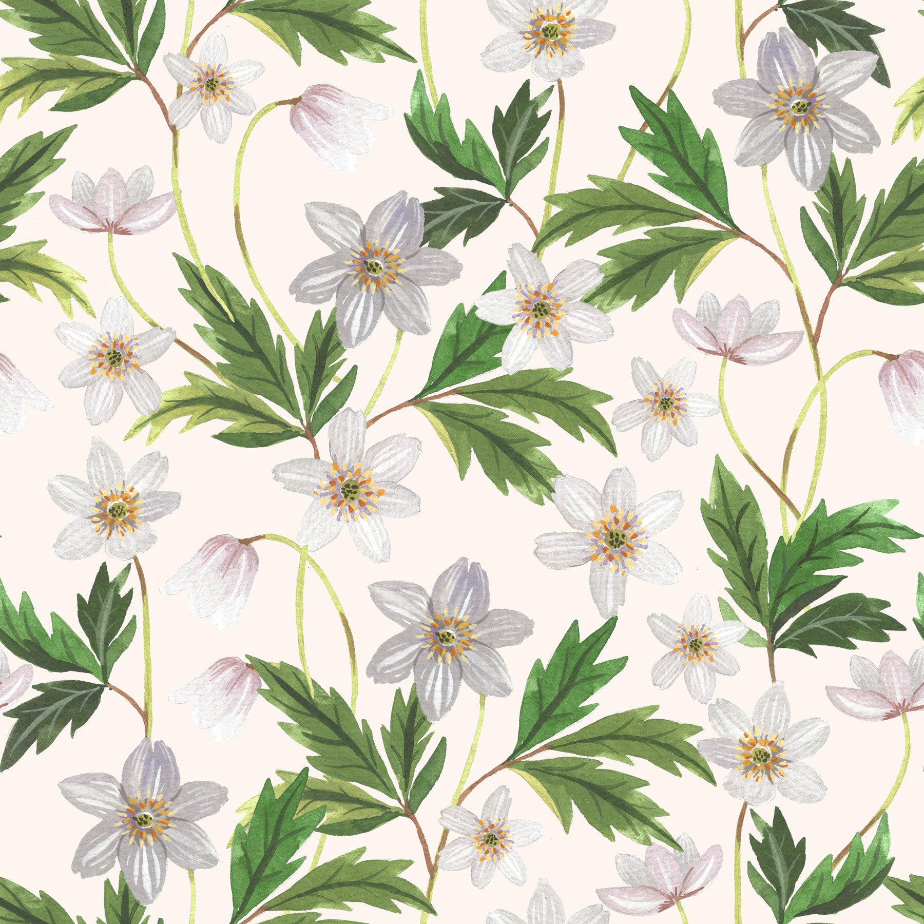 Embrace the delicate beauty of springtime with this enchanting wallpaper. A watercolor-inspired design features a profusion of Wood Anemones, their pristine white petals and soft yellow centers standing out against a gentle off-white background. Lush green foliage gracefully intertwines with the blossoms, creating a seamless, elegant pattern. This wallpaper evokes a sense of serene tranquility, perfect for adding a touch of natural elegance to any digital device. The detailed botanical illustration brings a feeling of calm and fresh air, ideal for those seeking a peaceful and stylish backdrop.