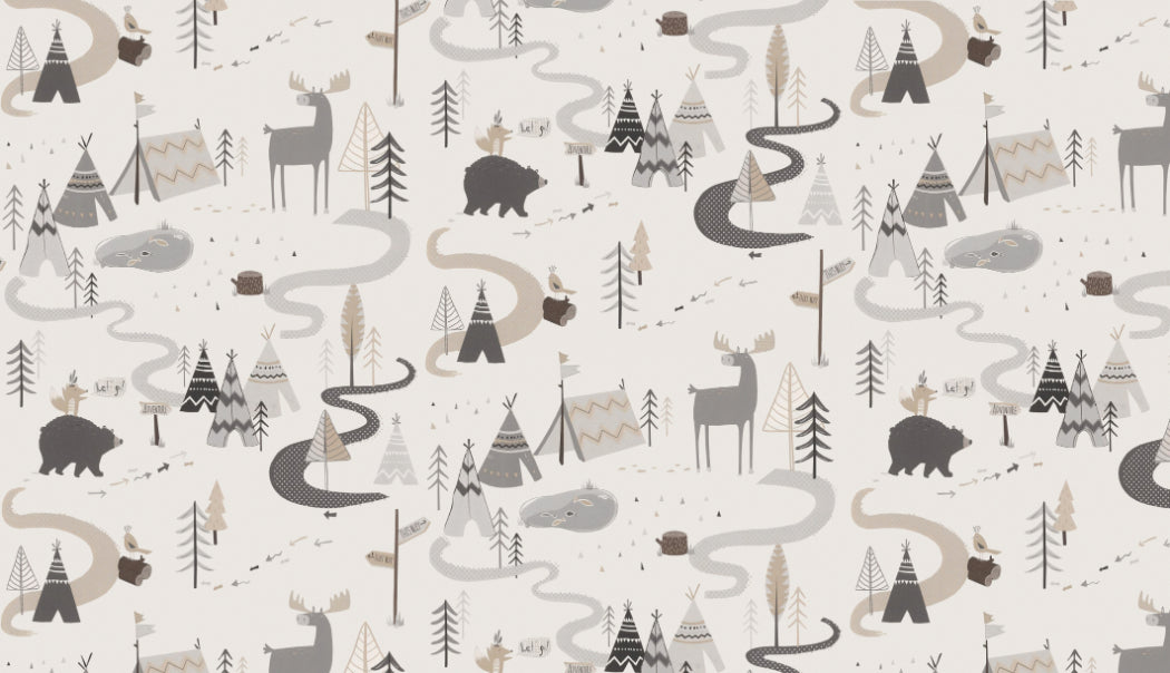 Cute woodland adventure wallpaper with animal patterns for kids.