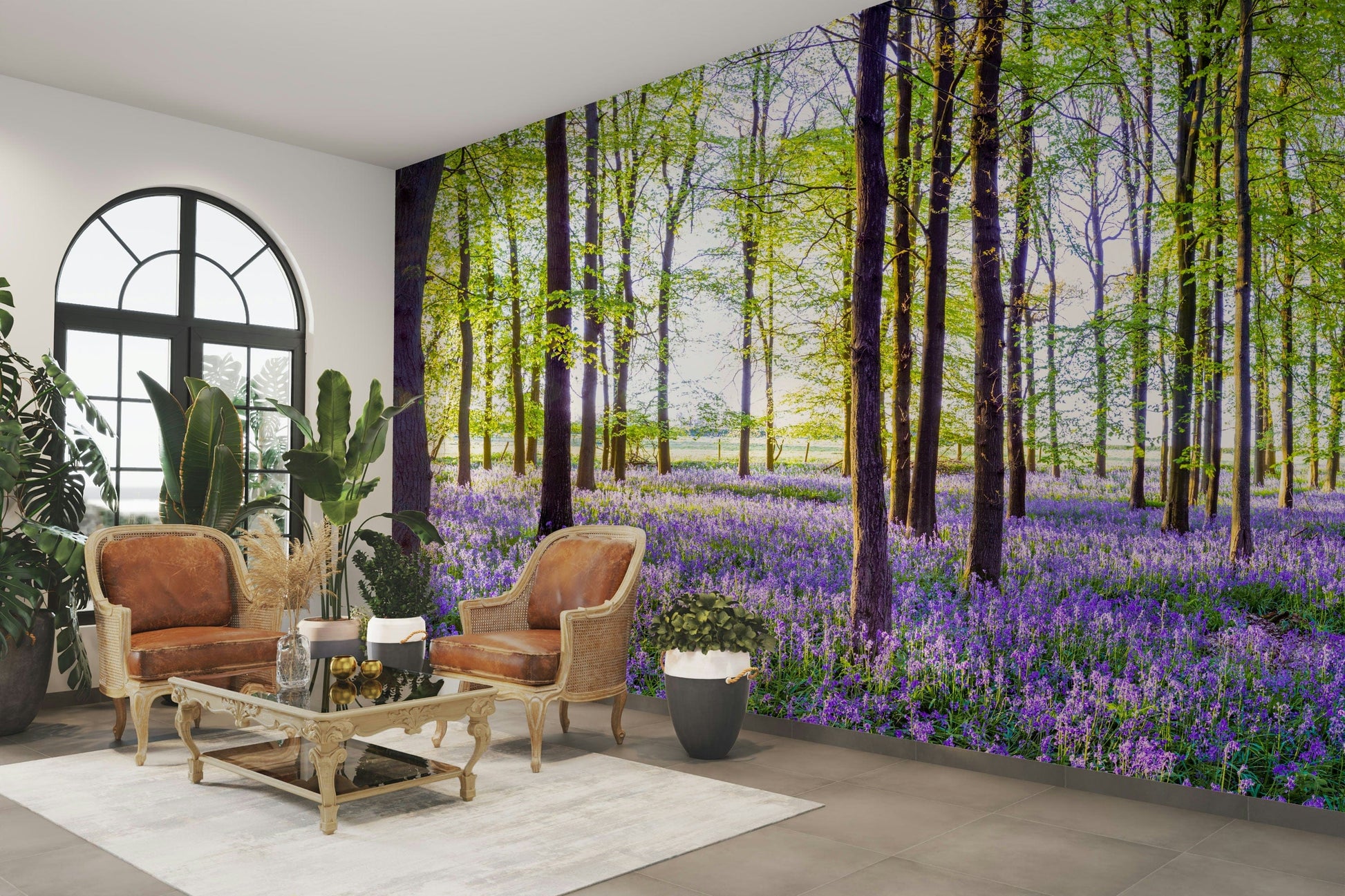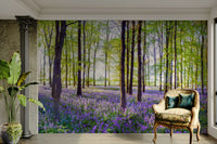 Immerse yourself in a peaceful woodland scene with this captivating wallpaper. Vibrant purple flowers stretch across the forest floor, contrasting beautifully with the green leaves and tall trees. Light shines through the trees, adding a warm glow. This wallpaper for walls makes a statement in any room. It enhances bedrooms, living rooms, or hallways. It complements rustic, farmhouse, and modern styles, bringing a touch of nature inside.