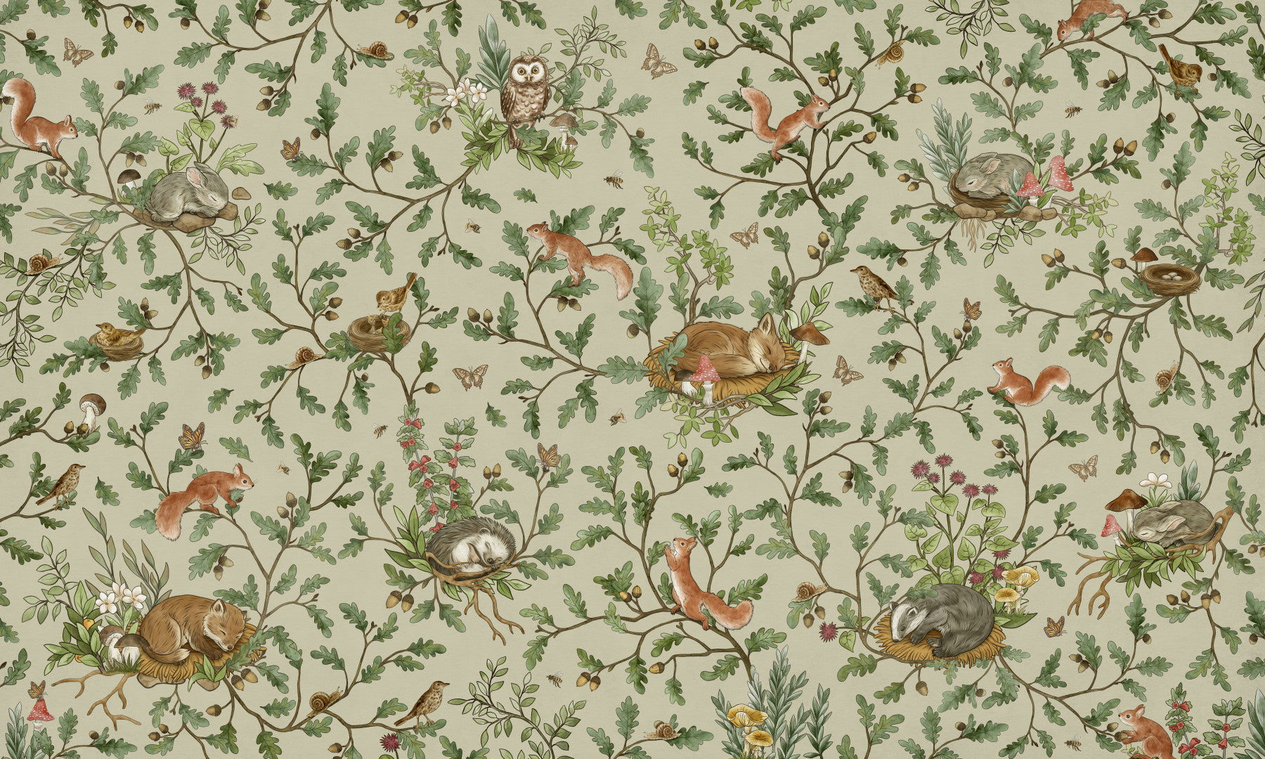 Invite a touch of forest charm into your home with this delightful wallpaper for walls. Softly illustrated forest creatures – squirrels, owls, and rabbits – snooze among oak branches and leaves on a serene backdrop. The muted green, beige, and brown tones lend a peaceful, natural feel. This design is perfect for a nursery, bedroom, or any room where you want to cultivate a calm, inviting space. It complements interiors with a nature-inspired elegance.