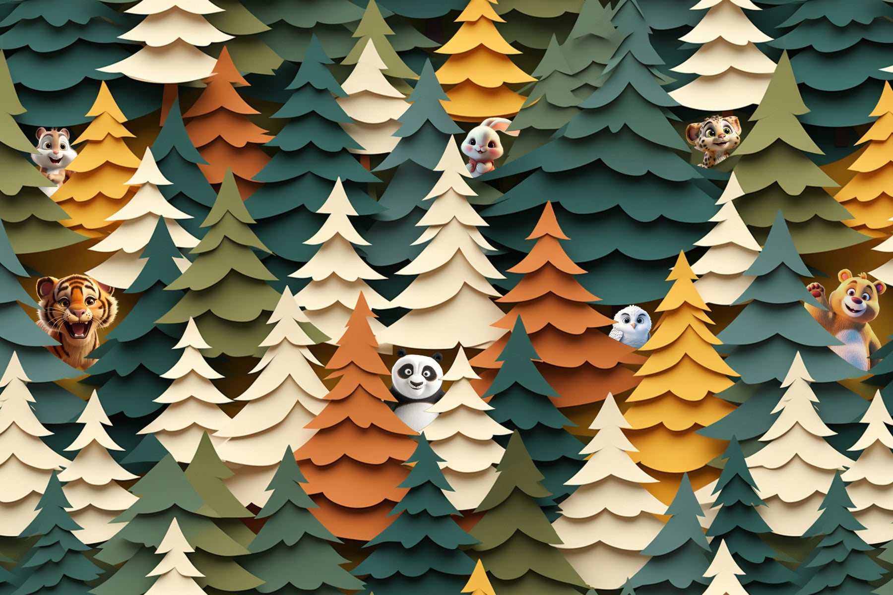 Delight your little ones with this whimsical forest wallpaper. Adorable cartoon animals hide among evergreen trees in various green, beige, orange and yellow hues. The layered design gives a 3D feel and creates a sense of depth. It is perfect for a kids' room, playroom, or nursery, it fosters a welcoming and cheerful ambiance. This wallpaper for walls makes any room feel lively and fun, complements playful décor.