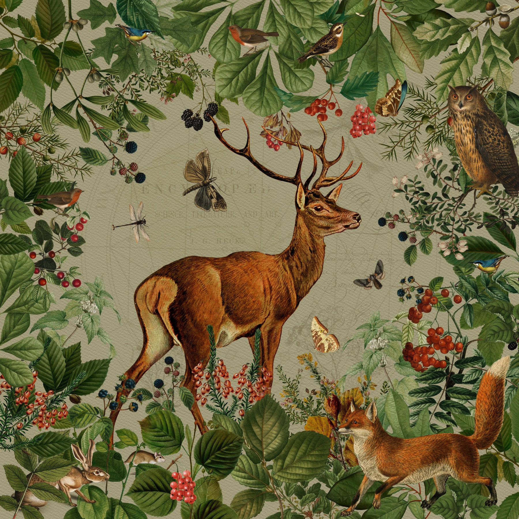 Discover 'Woodland Wonders,' a captivating wallpaper design celebrating the beauty and tranquility of the forest. This enchanting piece features a majestic stag as the focal point, surrounded by a rich tapestry of meticulously rendered foliage, vibrant berries, and charming woodland creatures. A playful fox adds a touch of dynamism to the scene, while delicate butterflies and birds enhance the overall sense of harmony. The detailed illustrations and earthy color palette create a sense of serene beauty, ideal for transforming your space into a peaceful haven. This wallpaper is perfect for those who appreciate the artistry of nature and the charm of vintage illustrations.