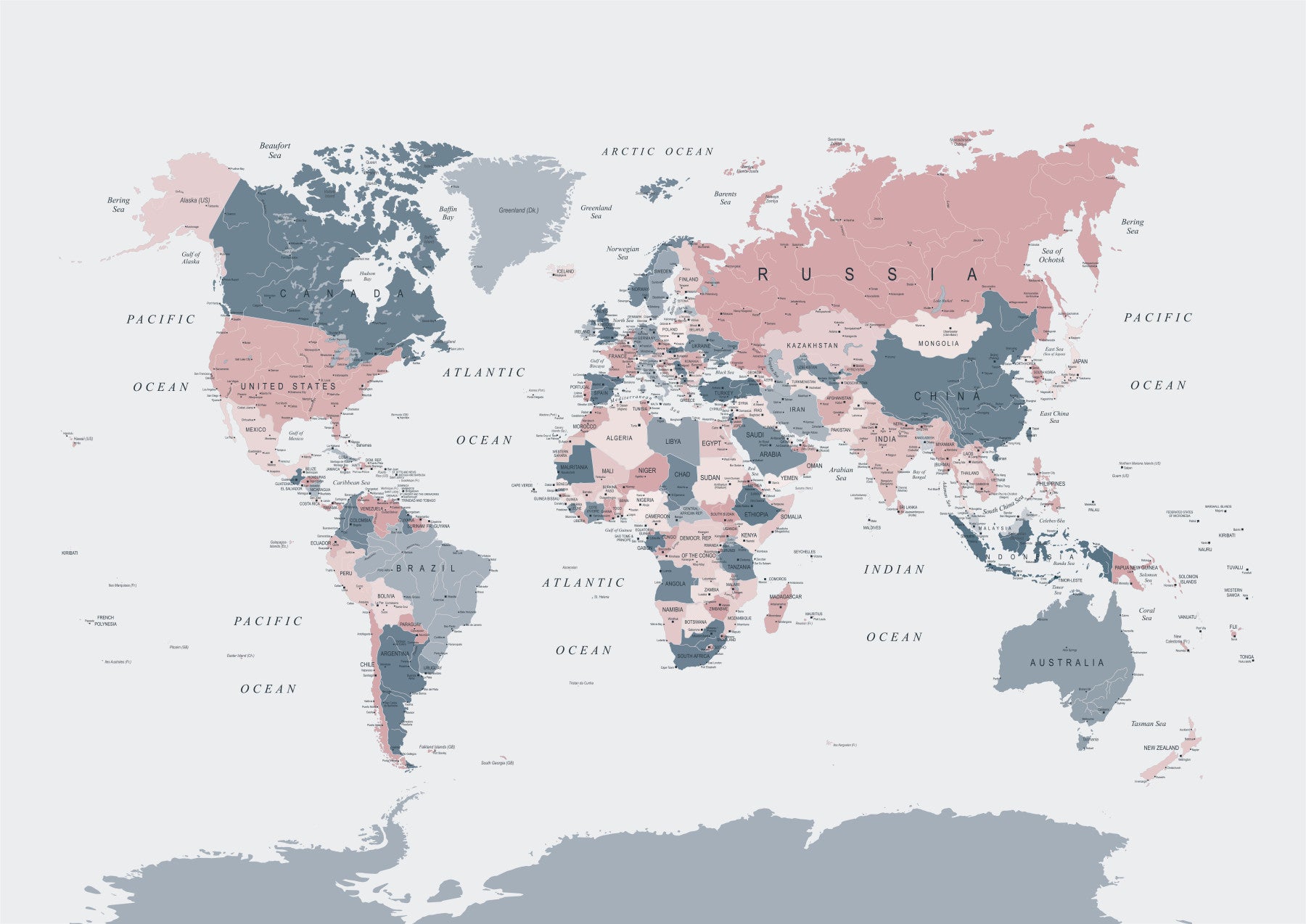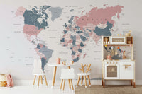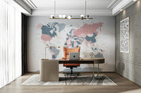 Embark on a visual journey around the globe with the 'World Map Blush Pink and Indigo' wallpaper. This captivating design offers a fresh and stylish take on the classic world map, blending the calming hues of blush pink and sophisticated indigo to create a serene and inspiring atmosphere. The continents are subtly distinguished by these complementary colours, providing a visually appealing contrast that enhances the map's details. Perfect for adding a touch of wanderlust to any room, this wallpaper serves as both a decorative statement and a reminder of the vast and diverse world we inhabit. Its elegant colour palette ensures seamless integration into various interior styles, from modern minimalist to eclectic bohemian. Elevate your space with this aesthetically pleasing and educational piece, sparking curiosity and inspiring dreams of far-off destinations.